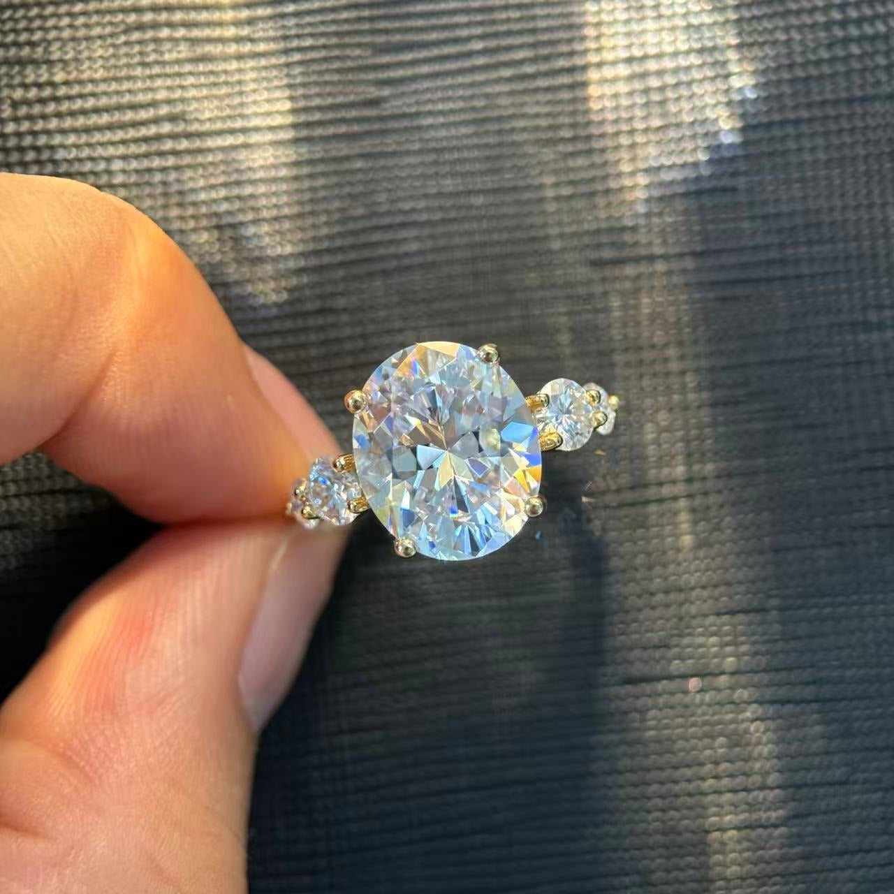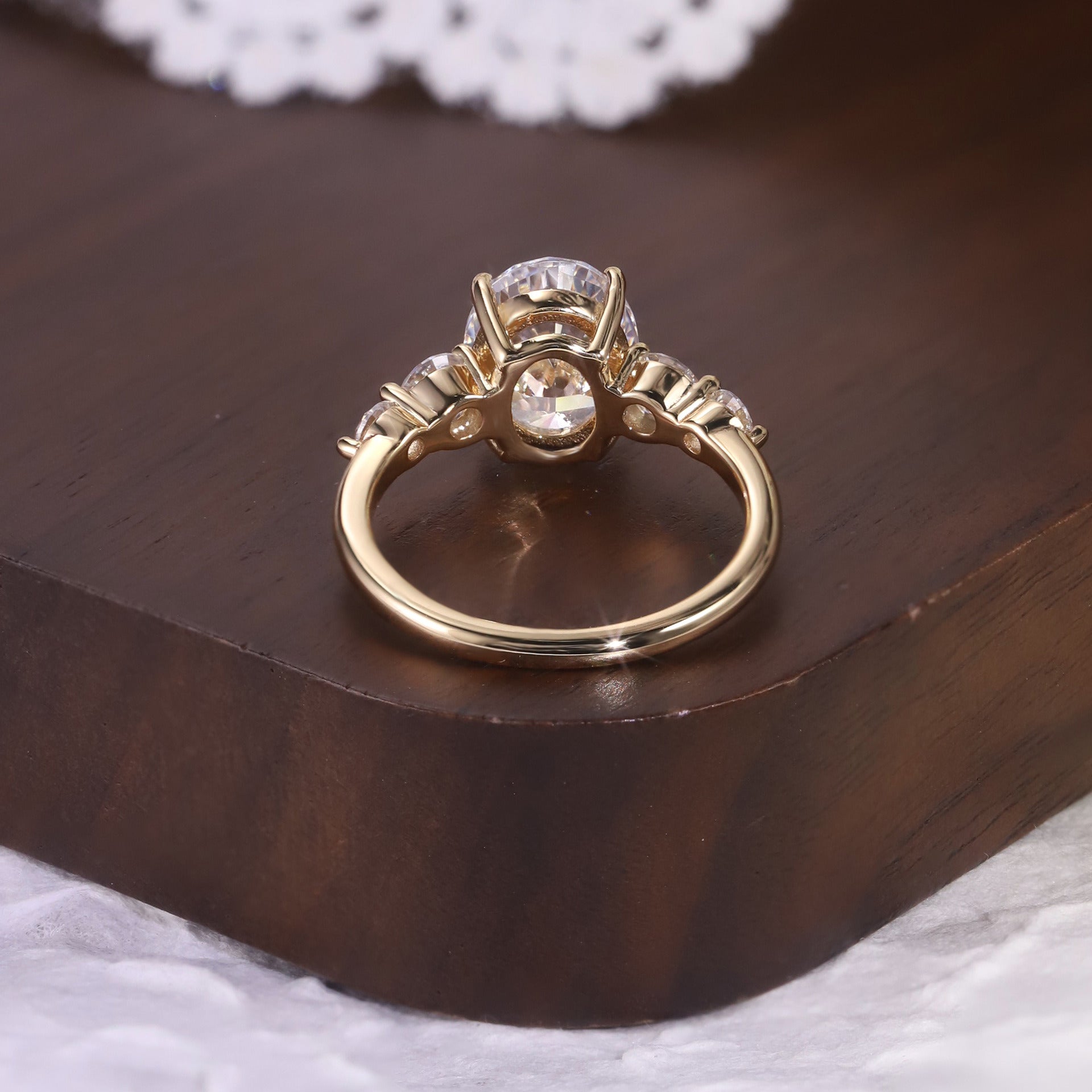 Each moissanite is hand-selected for near-colorless D–E grading and VVS clarity, offering exceptional brilliance and fire. The oval cut enhances light performance, giving the ring a radiant and sophisticated glow.