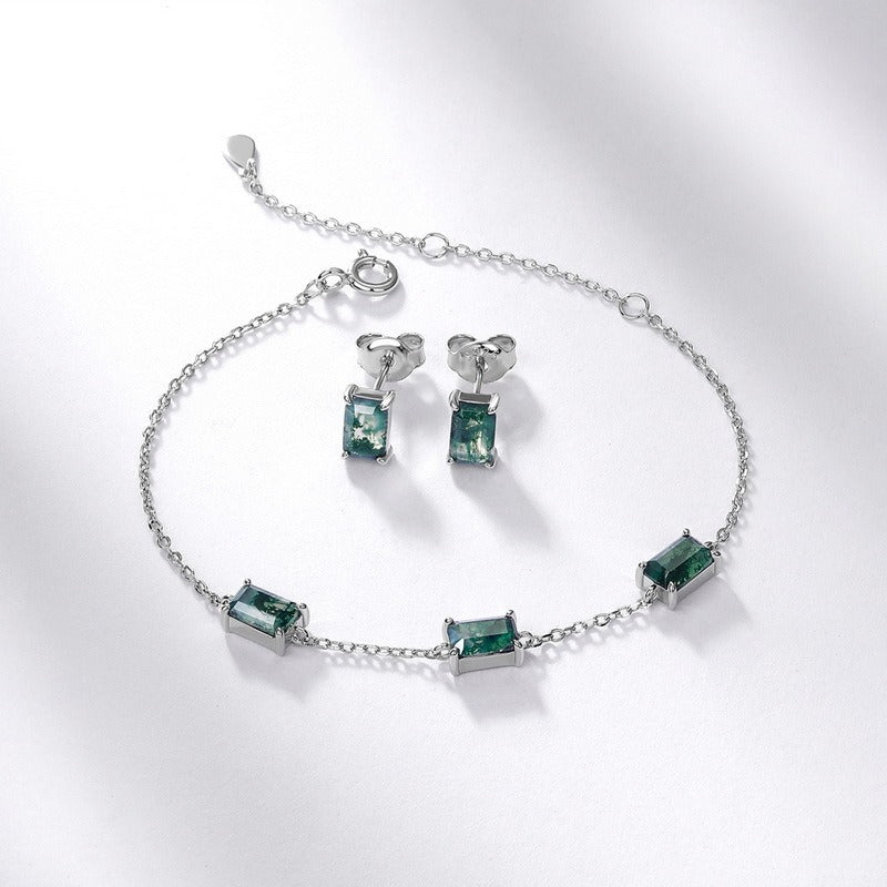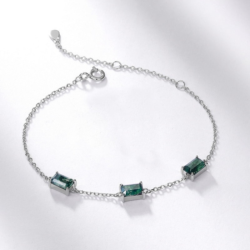 - Exquisitas piedras preciosas de ágata de musgo: esta pulsera presenta tres impresionantes piedras preciosas de ágata de musgo, reconocidas por su belleza natural y patrones únicos, que agregan un toque de elegancia a su muñeca.