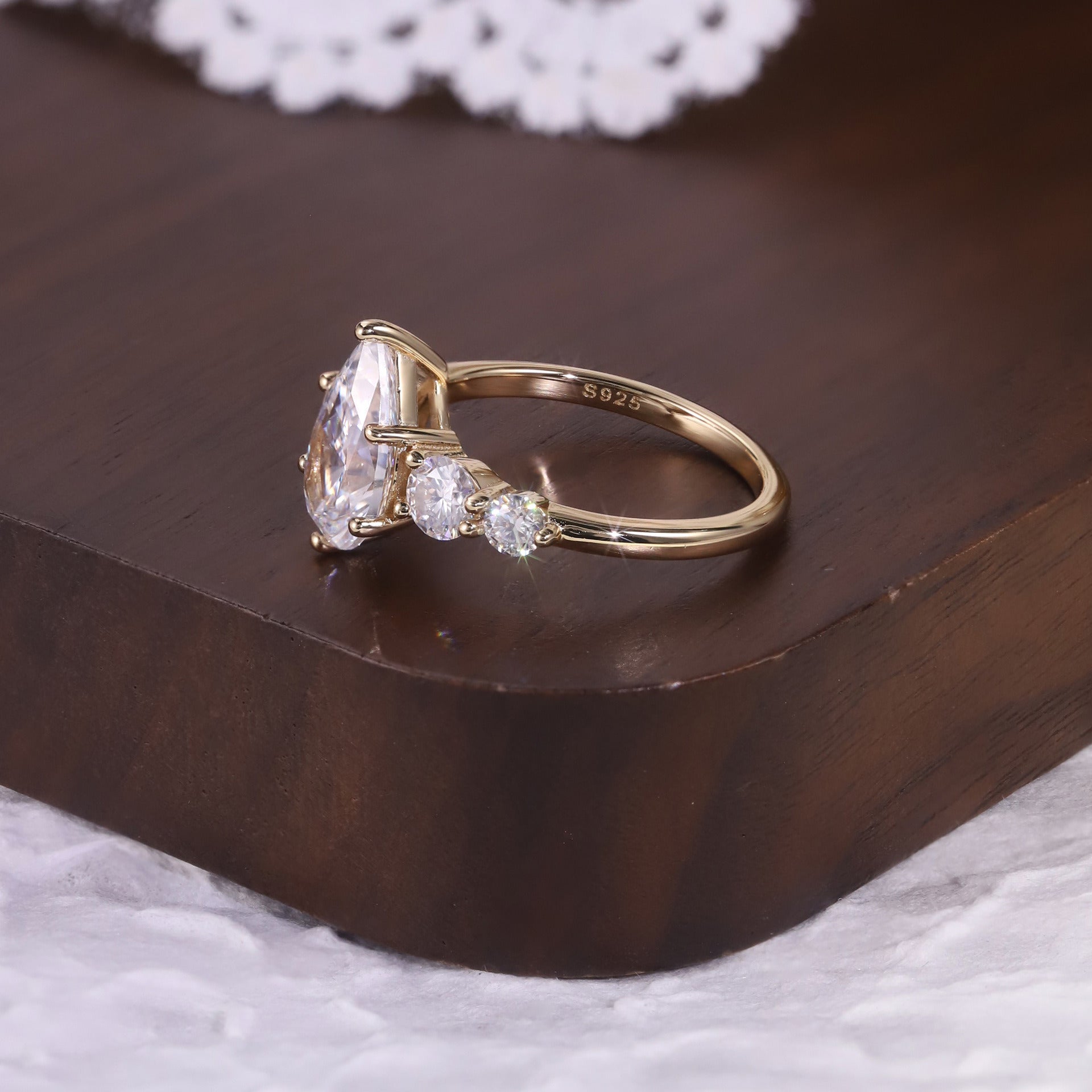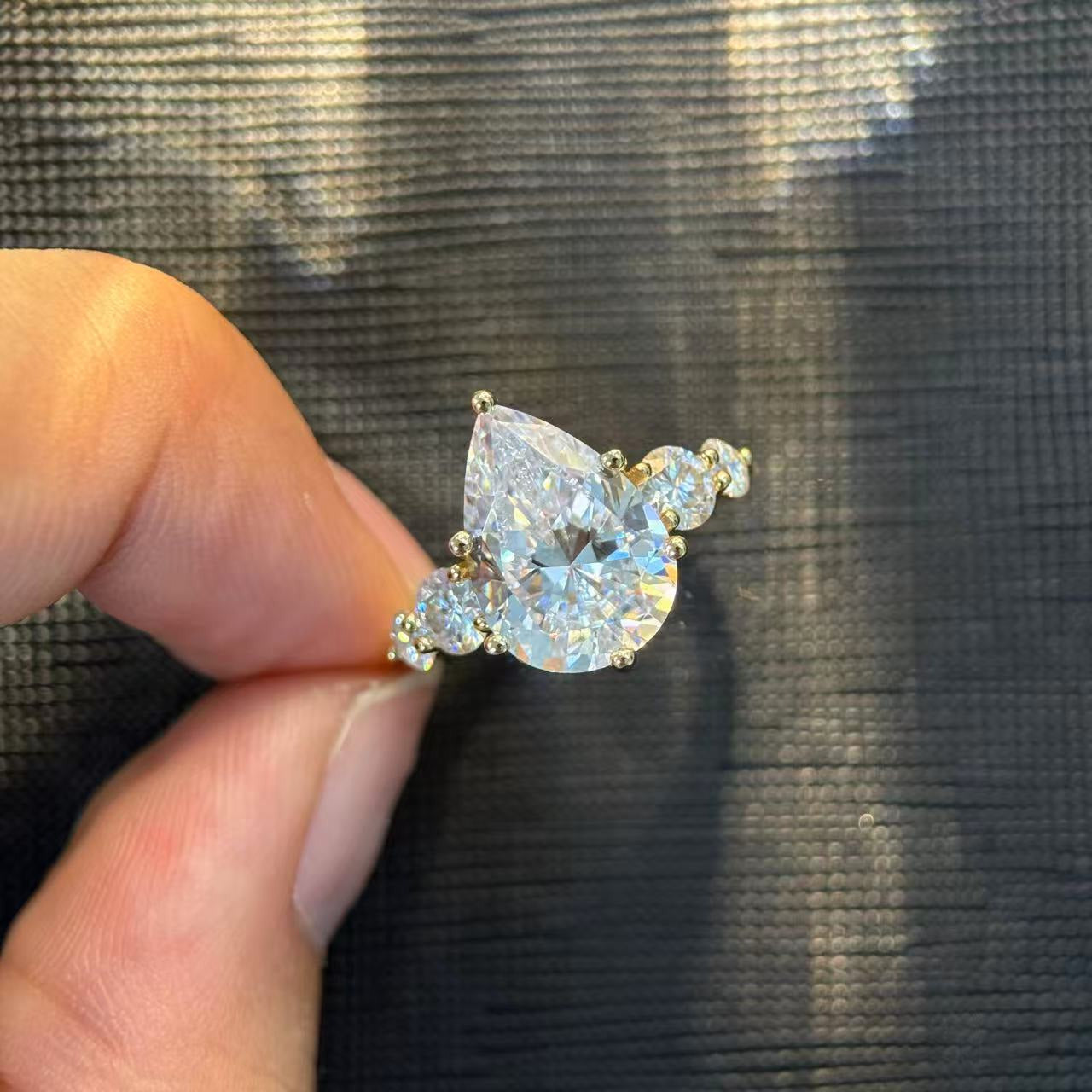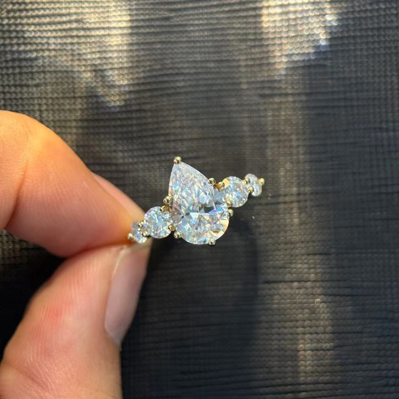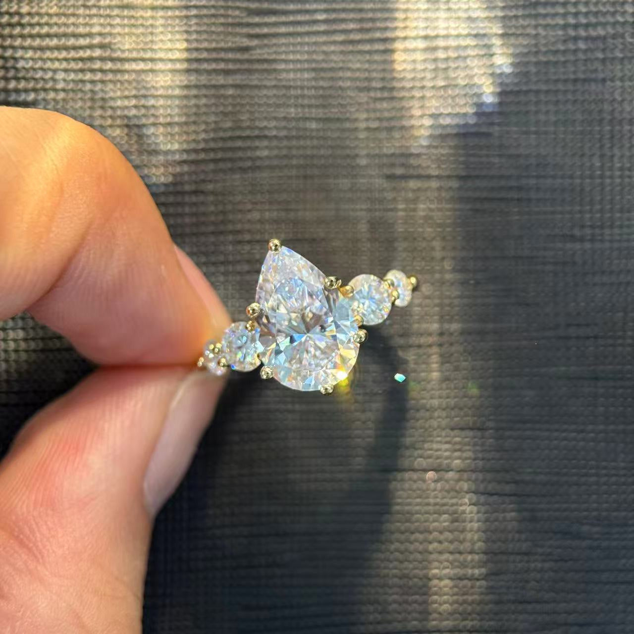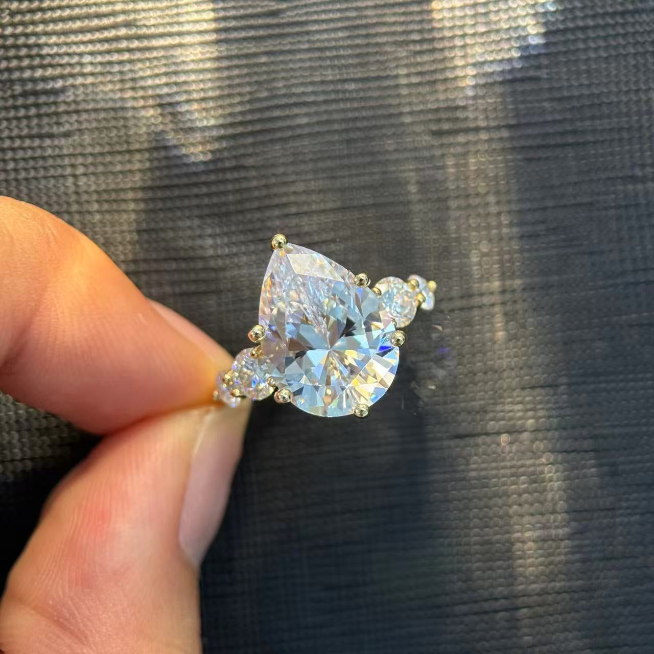 Designed for women who love timeless sparkle with a modern twist, this pear-shaped five-stone ring features a bold center stone supported by four perfectly matched side stones. The fire and brilliance of high-grade moissanite deliver a diamond-like look without the cost, while the hypoallergenic S925 sterling silver ensures comfort for daily wear. Each stone is handset to create a symmetrical, luminous arc—symbolizing love, growth, and shared memories. Available from 1ct to a show-stopping 6ct, this series offers choices for every style, occasion, and personality.