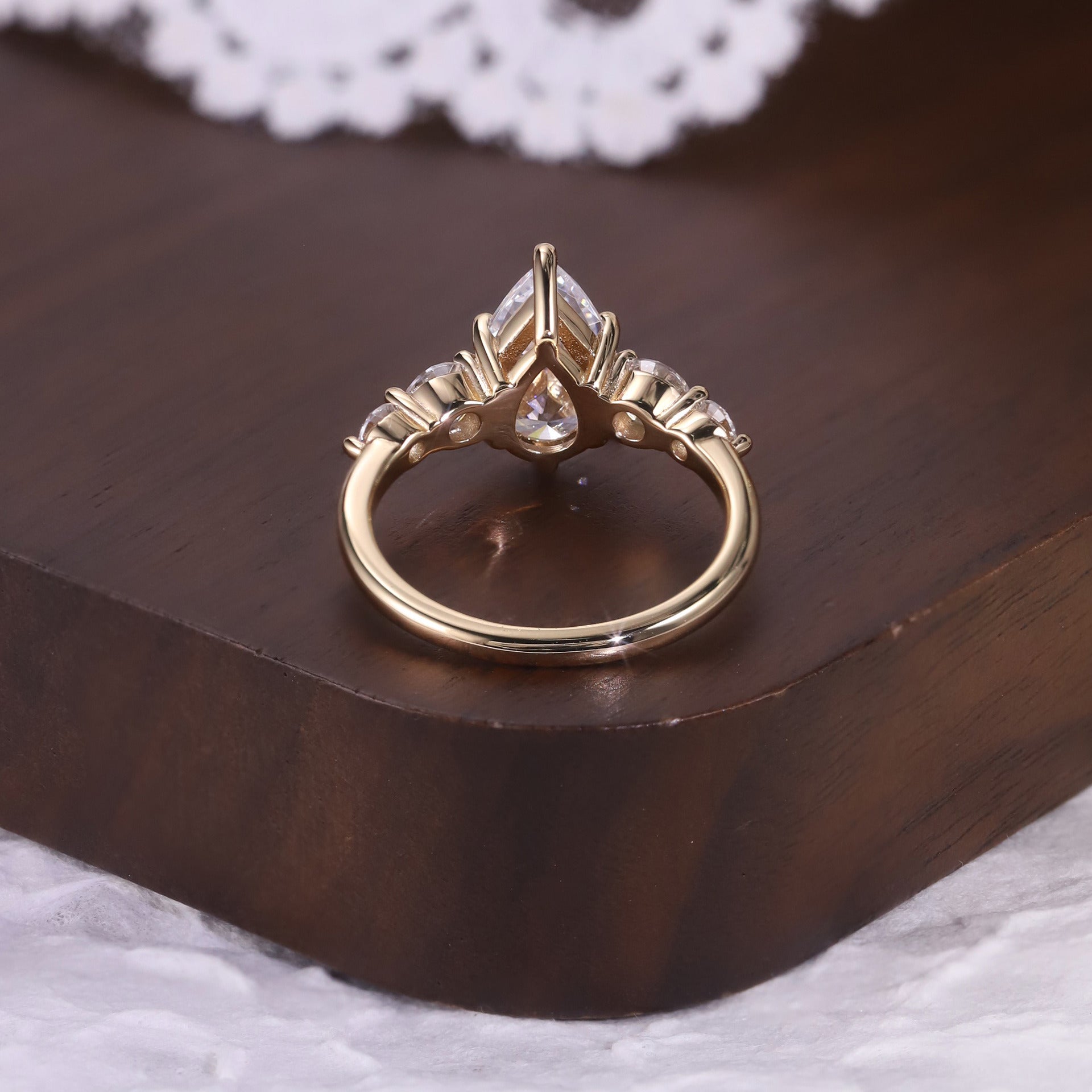 Crafted with a Pear Cut center stone and four matching side stones, this ring brings a refined yet eye-catching silhouette. The elongated tear-drop profile enhances finger length while offering a soft, romantic glow.