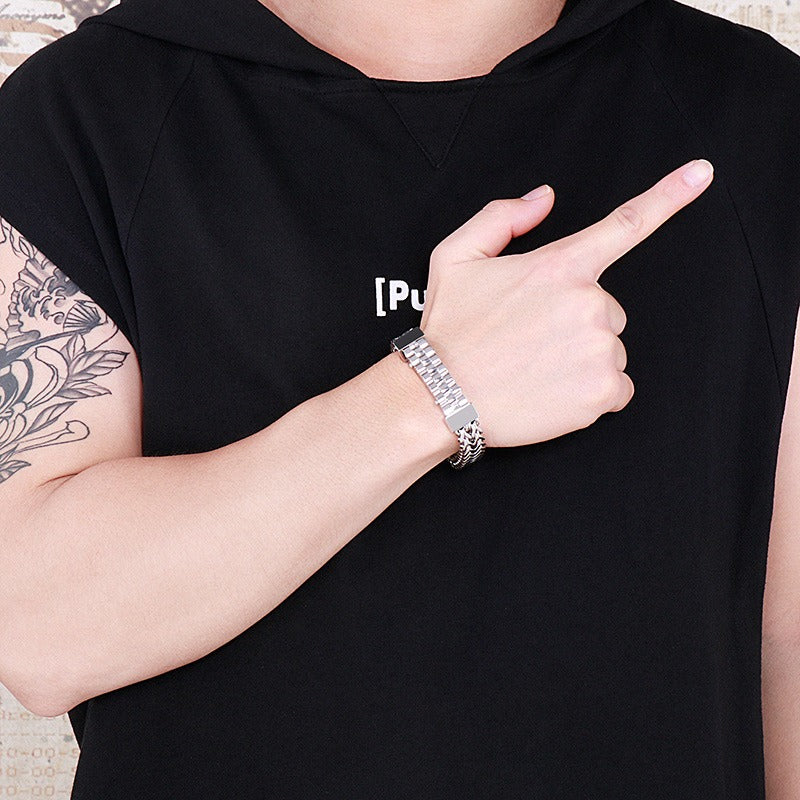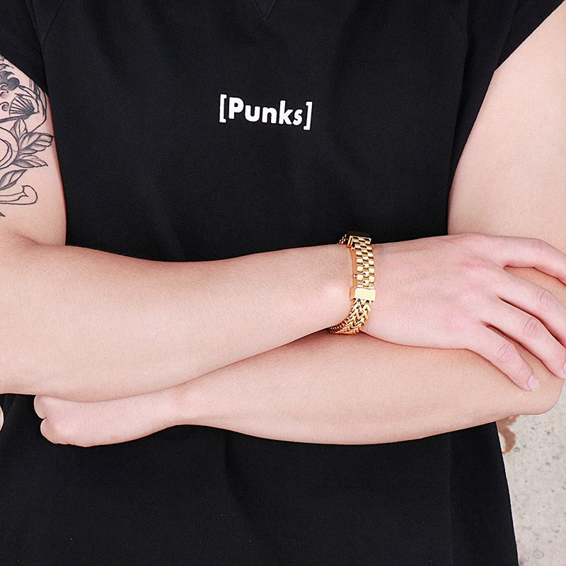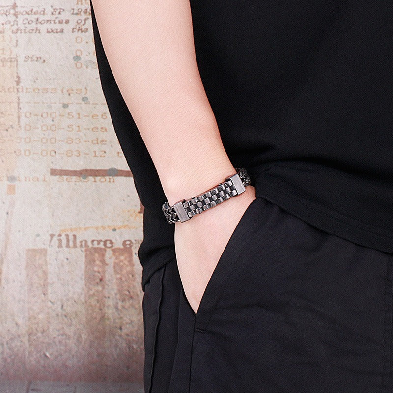 Wear men’s titanium steel reversible chain bracelet to feel a solid, balanced structure settle on the wrist, delivering controlled presence through daily wears.