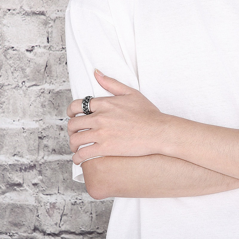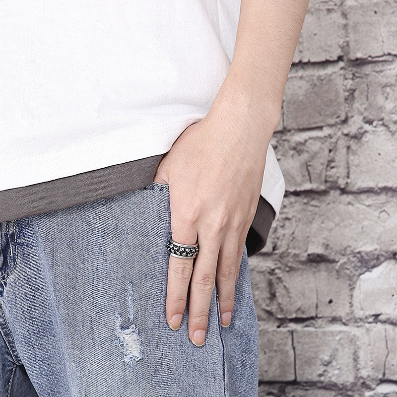 Wear this men’s rotating skull ring in titanium steel to feel smooth spin, steady weight, and a centered fit that stays calm and controlled through daily hand movement.