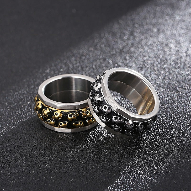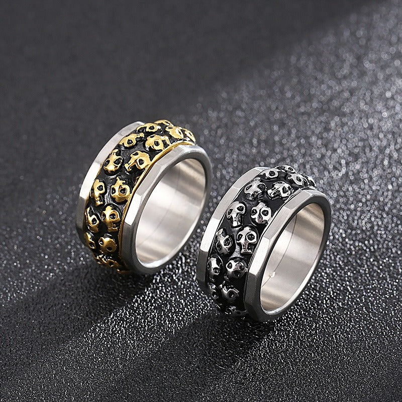 Two layers of sculpted skulls form a rotating outer ring, creating depth, motion, and a strong visual rhythm while keeping the band centered on the finger.