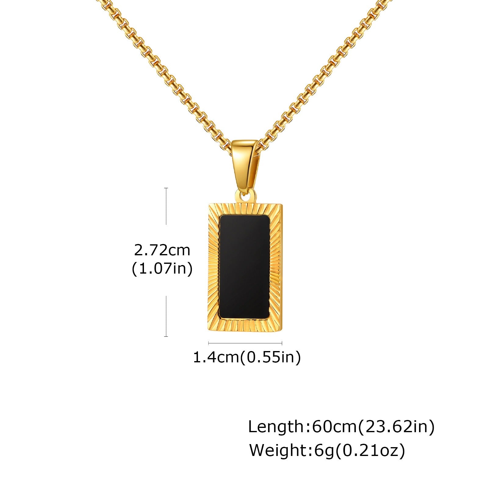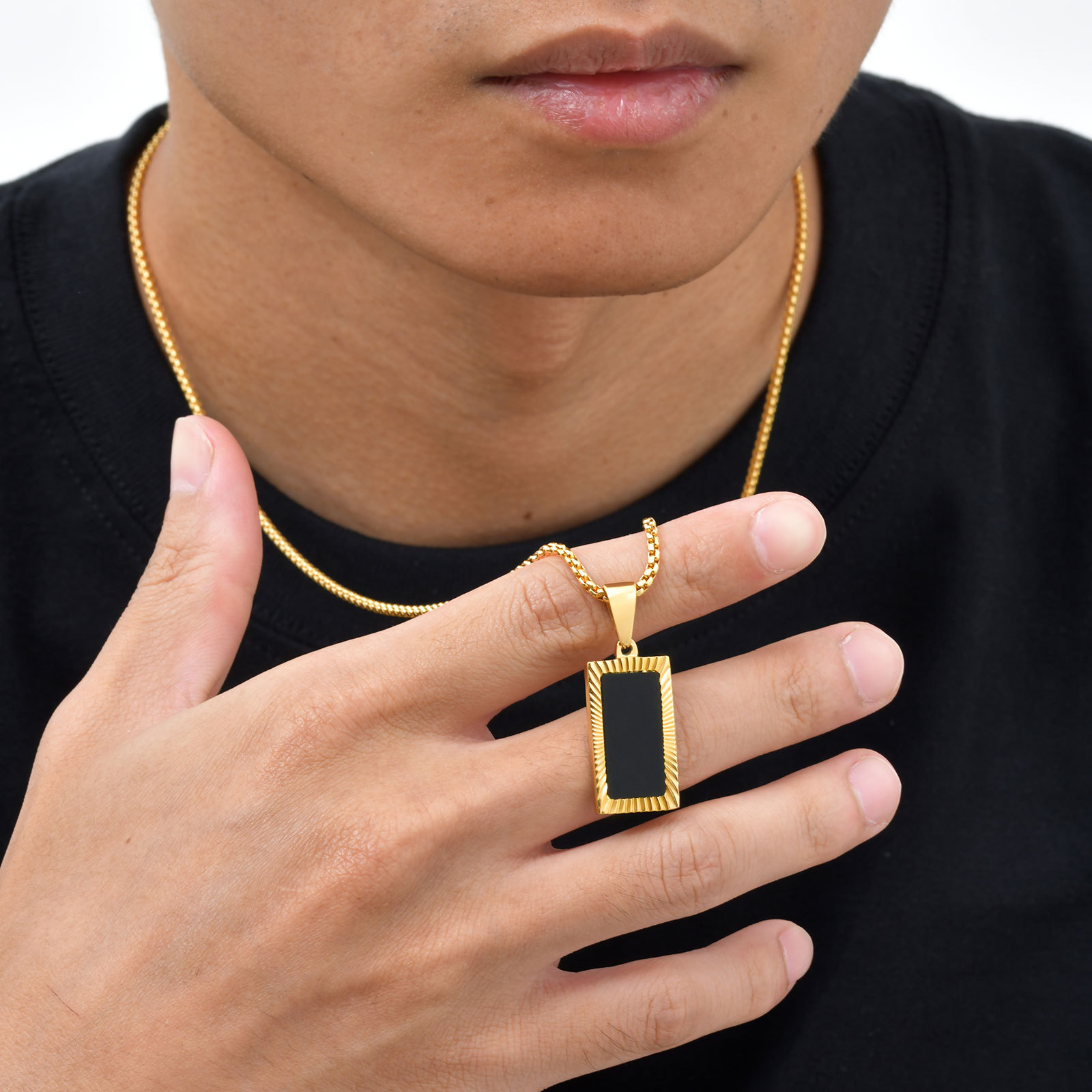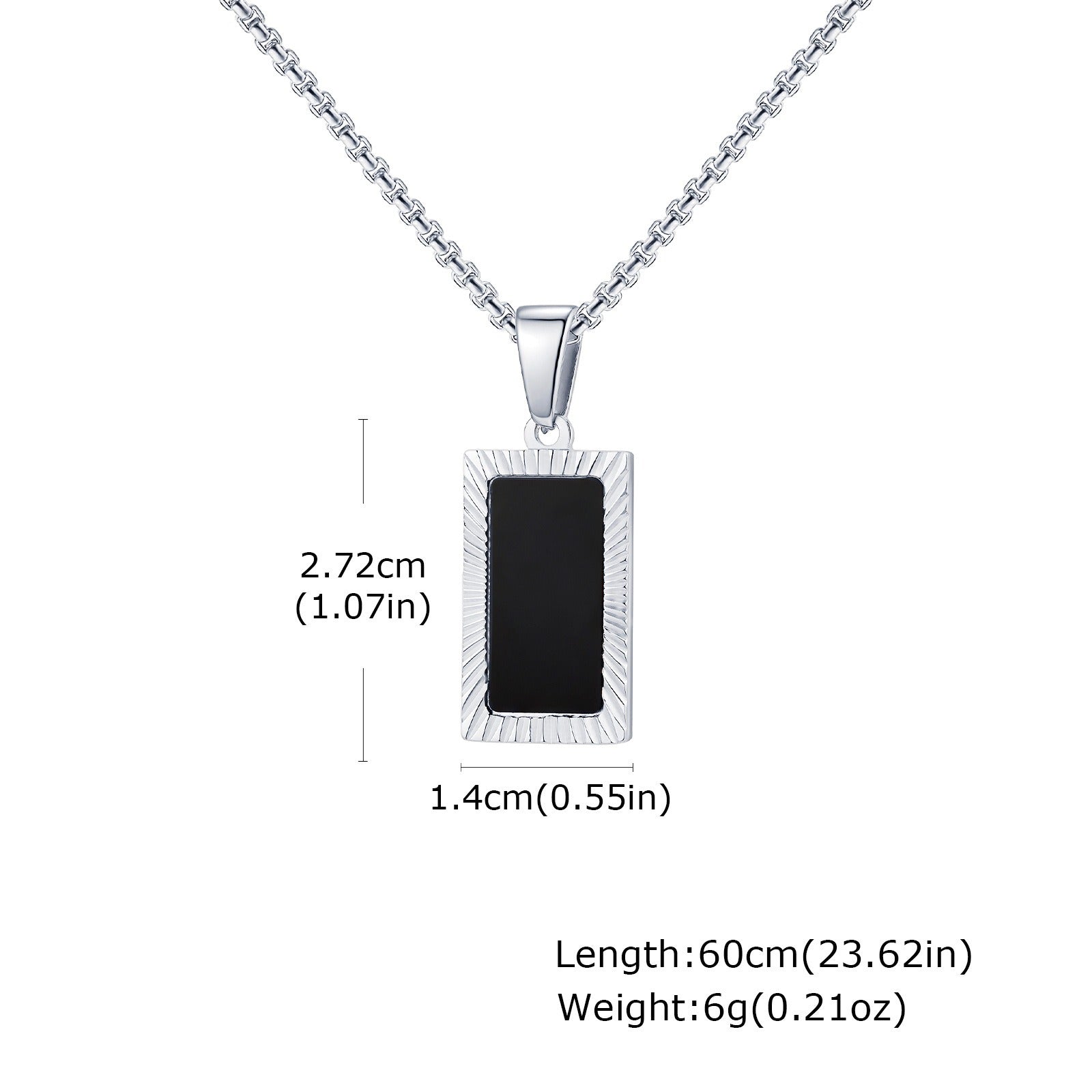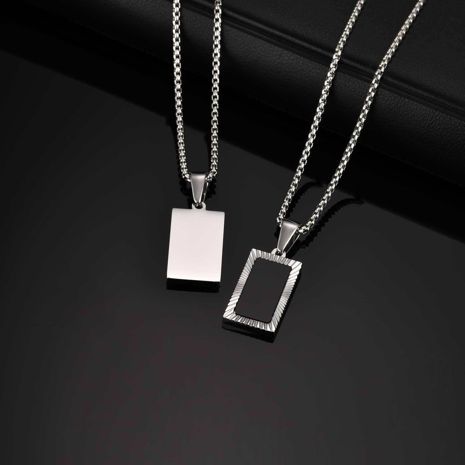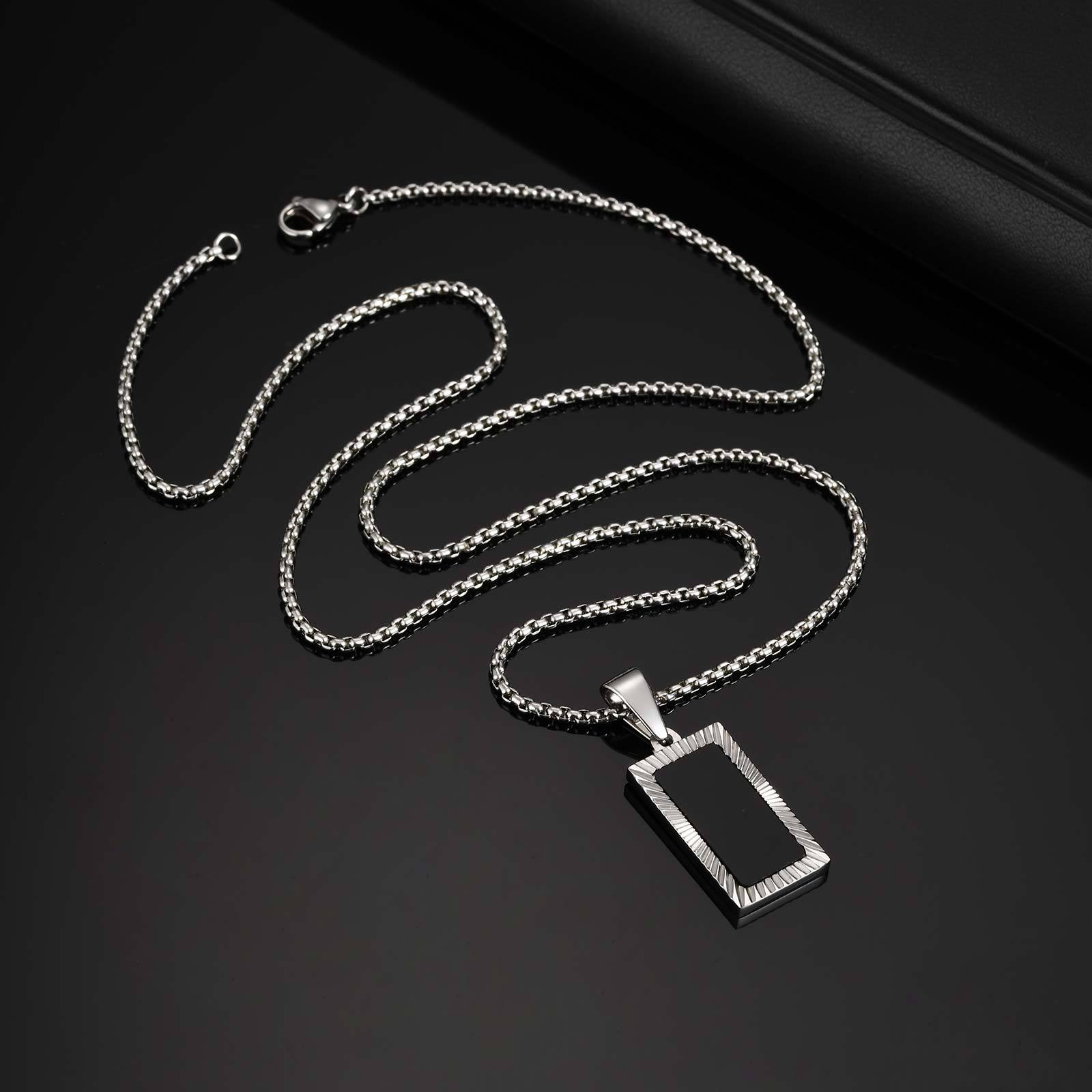 Wear controlled structure with this stainless steel rectangular pendant necklace for men. A black acrylic center and carved frame create steady contrast that sits clean and balanced for daily wear.