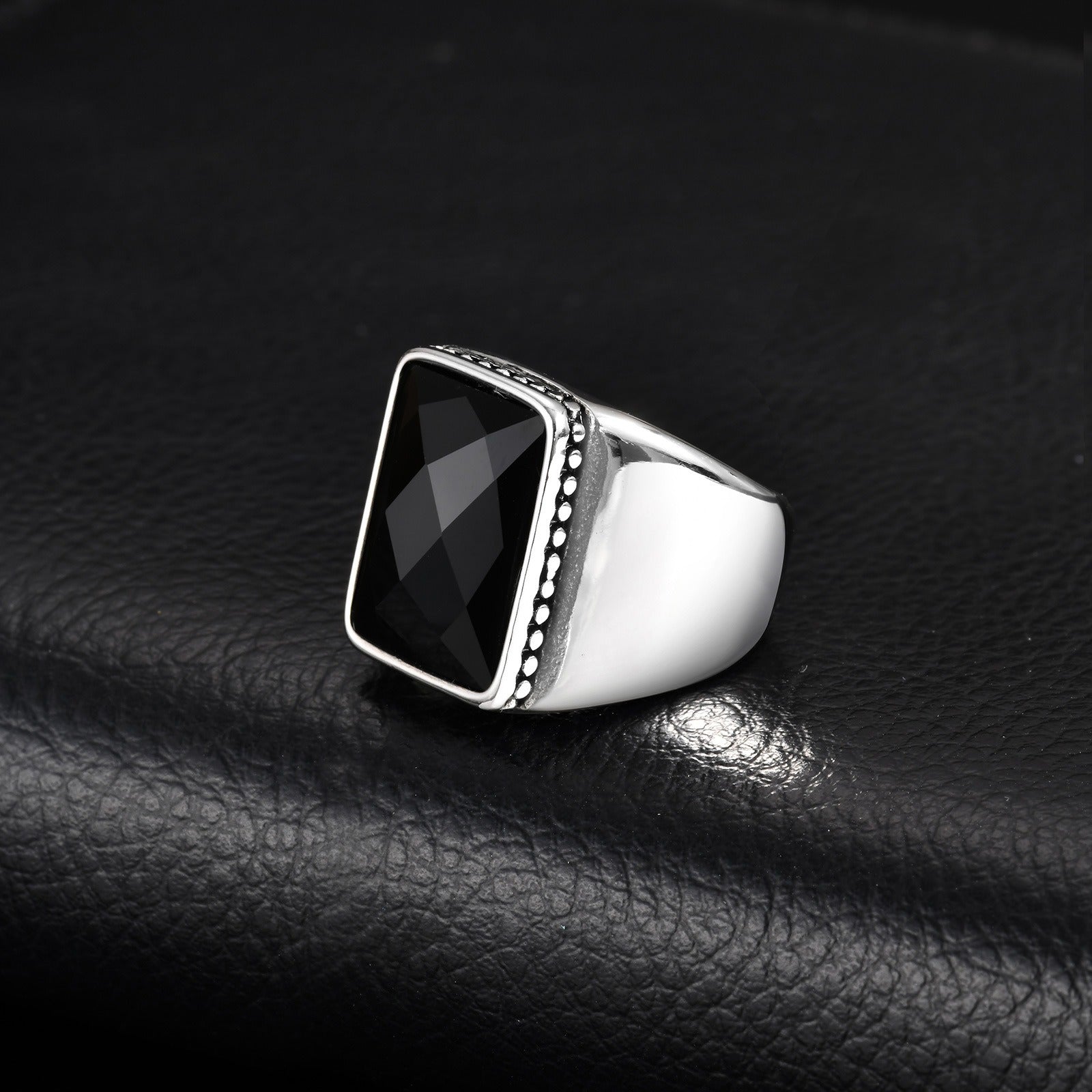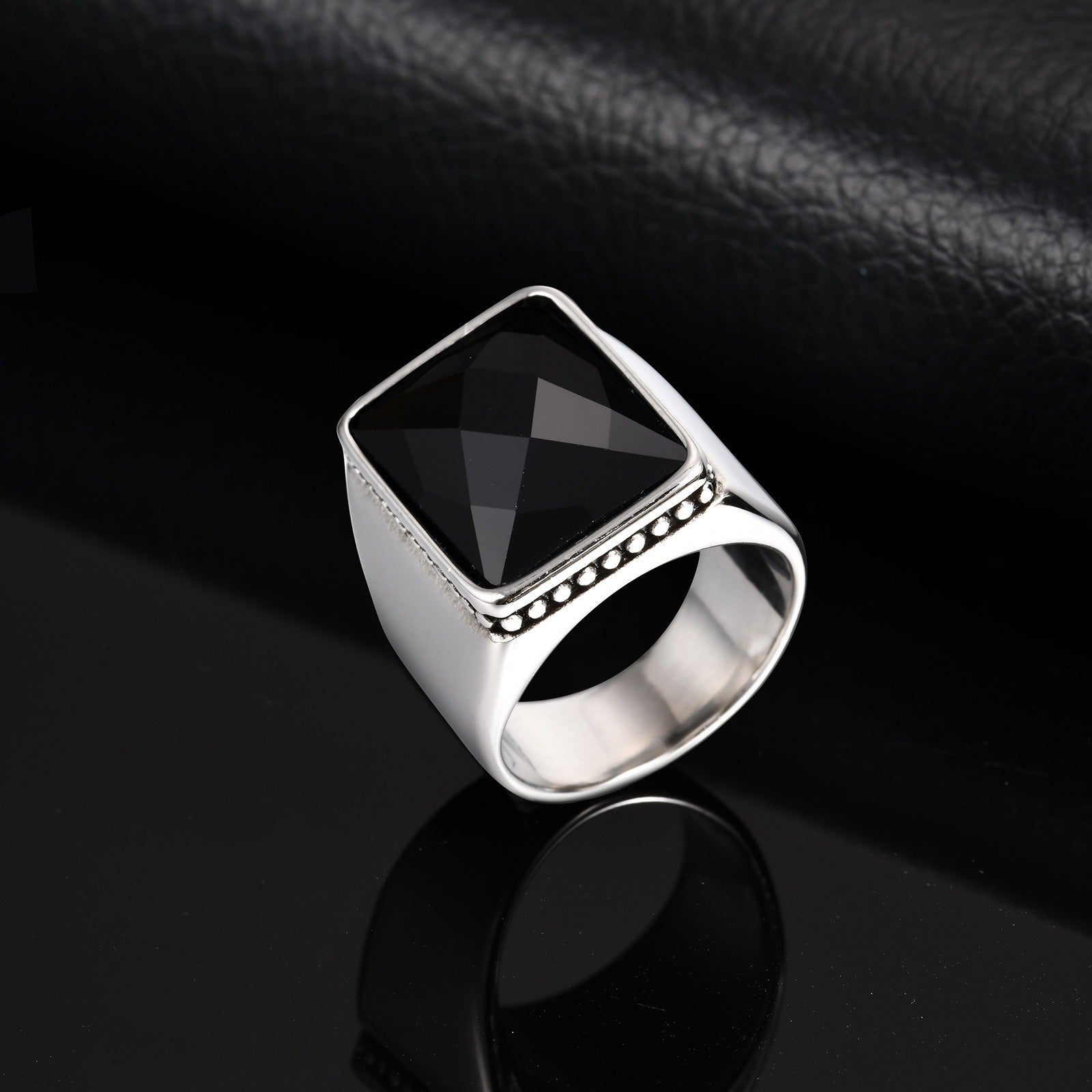 Kemstone Men’s Stainless Steel Ring – Faceted Black Glass Square Signet RC-923