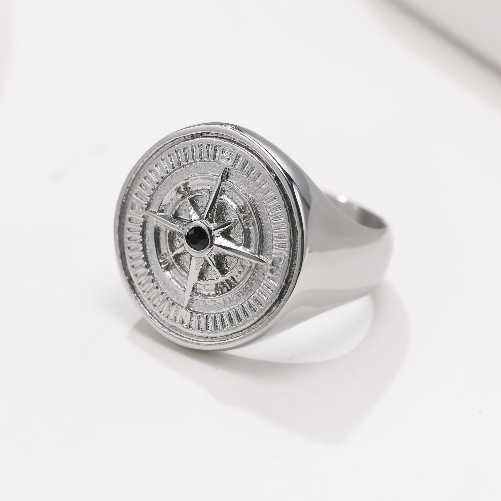 Wear steady direction with this stainless steel compass ring for men. Solid casting and a centered black accent create balance, focus, and a grounded feel for everyday wear.