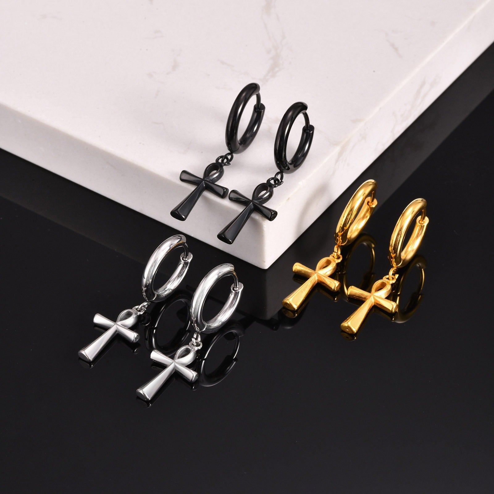 Estos aretes en forma de cruz para hombre están forjados con acero inoxidable de primera calidad, fabricados para durar, para hablar sin gritar.