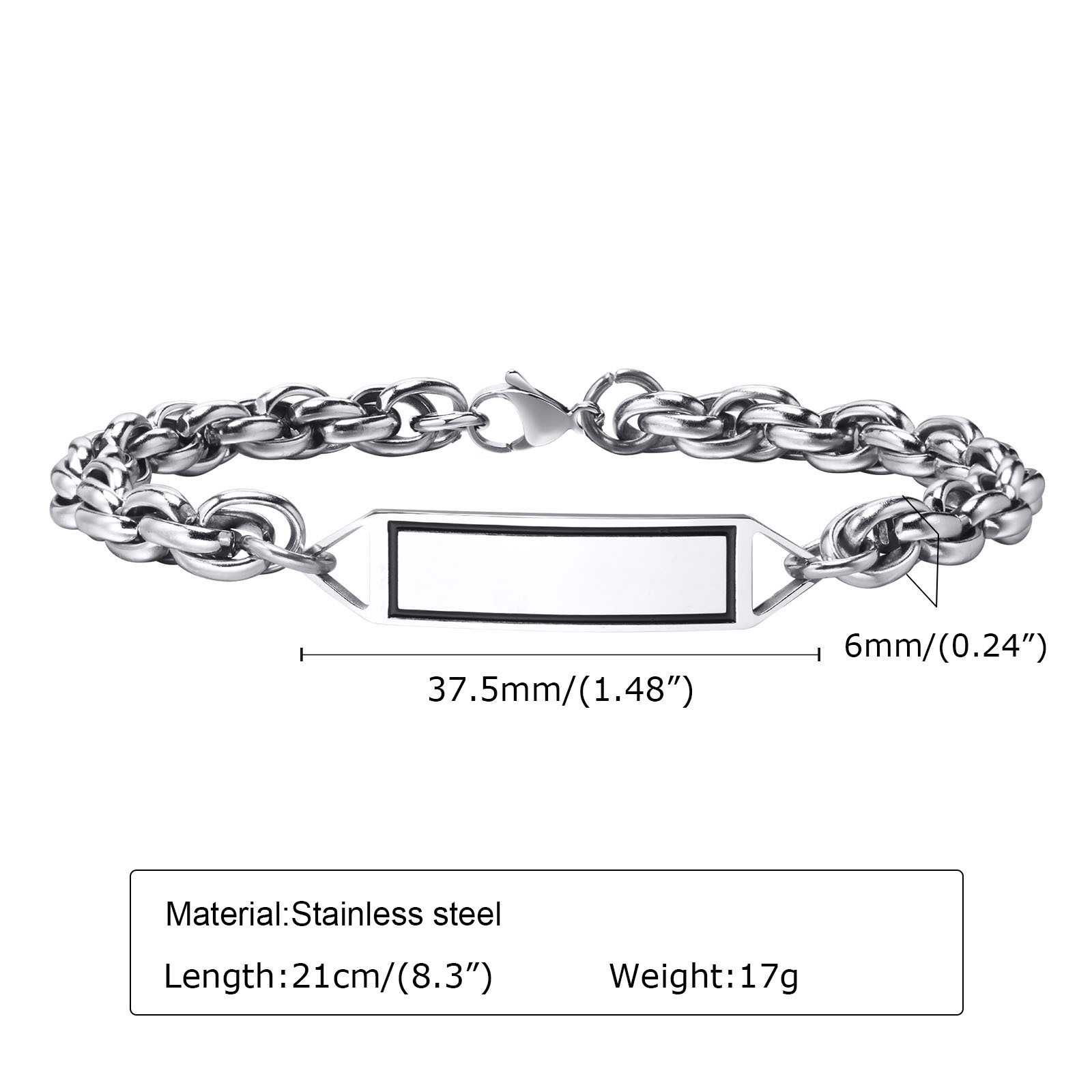 Length approx. 21 cm (8.3 in), chain width about 6 mm, weight about 17 g. The bracelet rests comfortably on the wrist for daily wear.