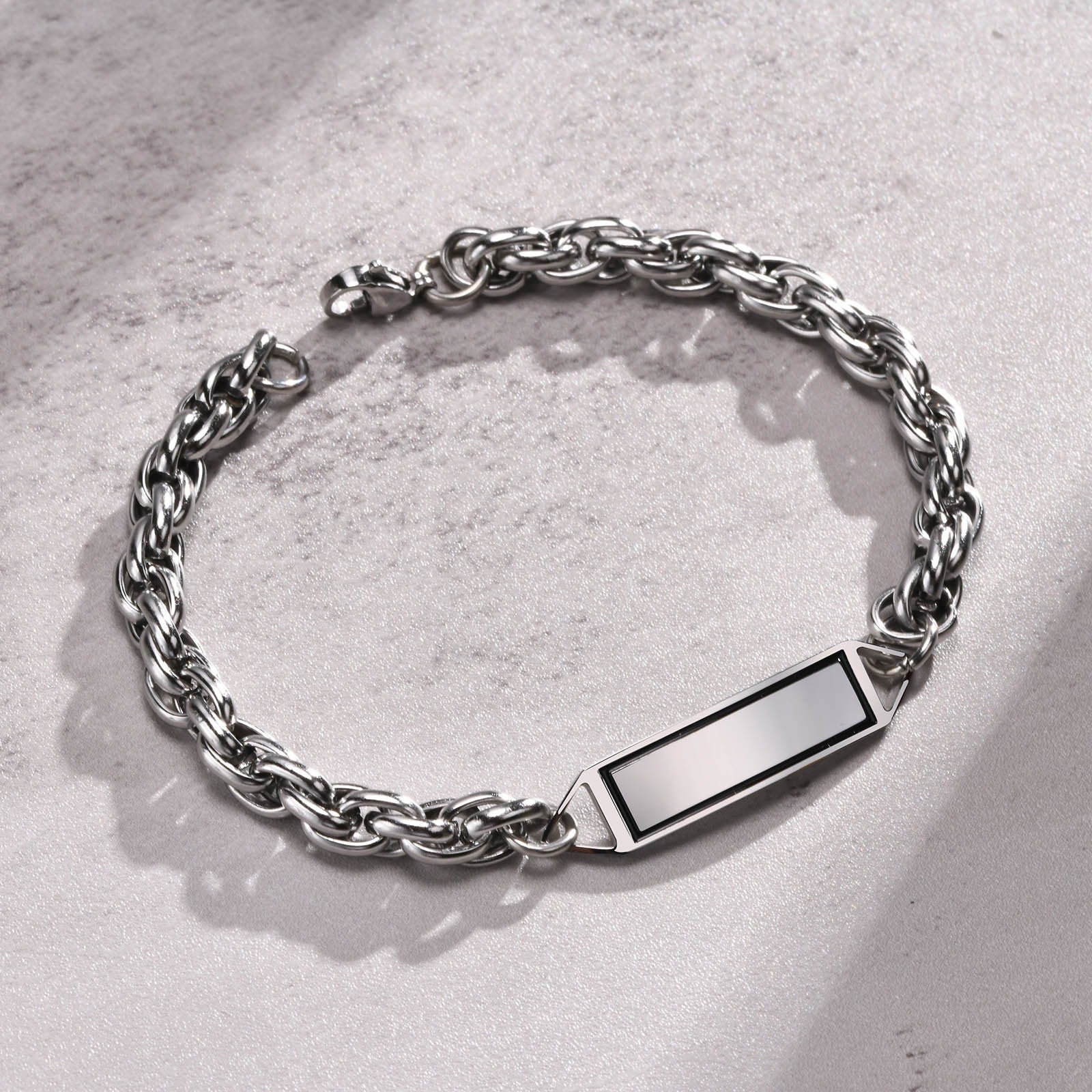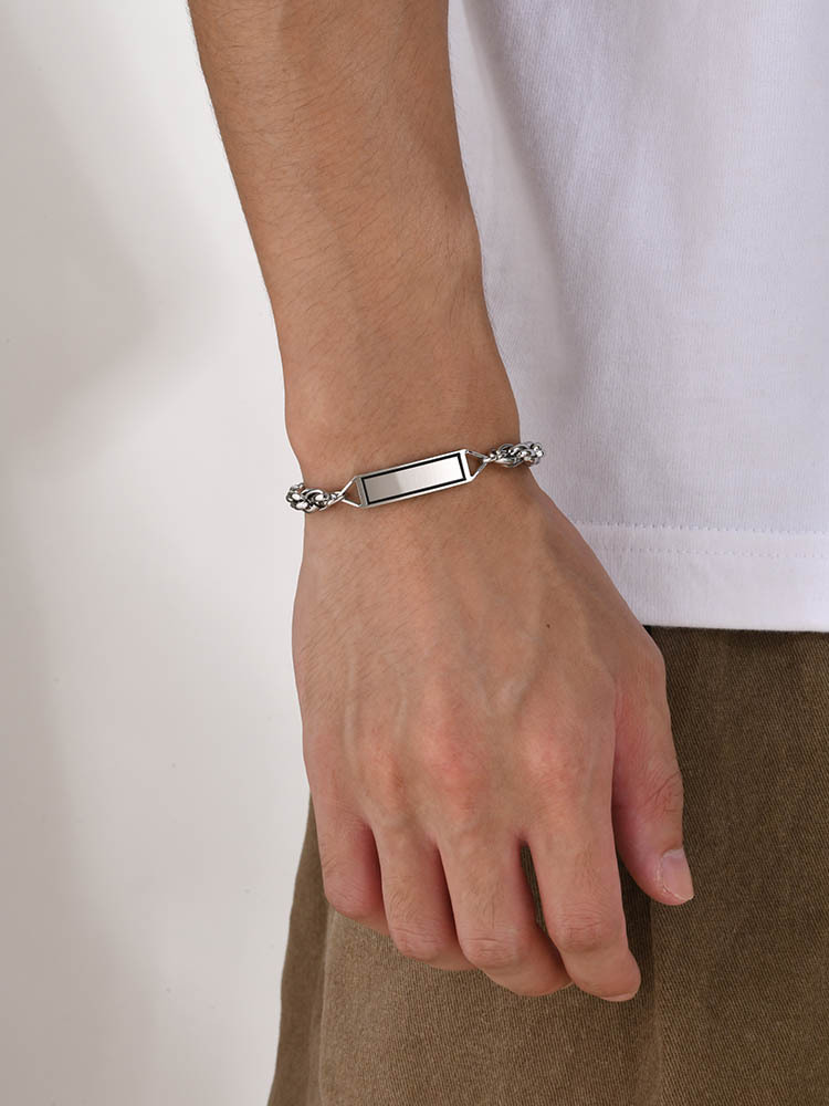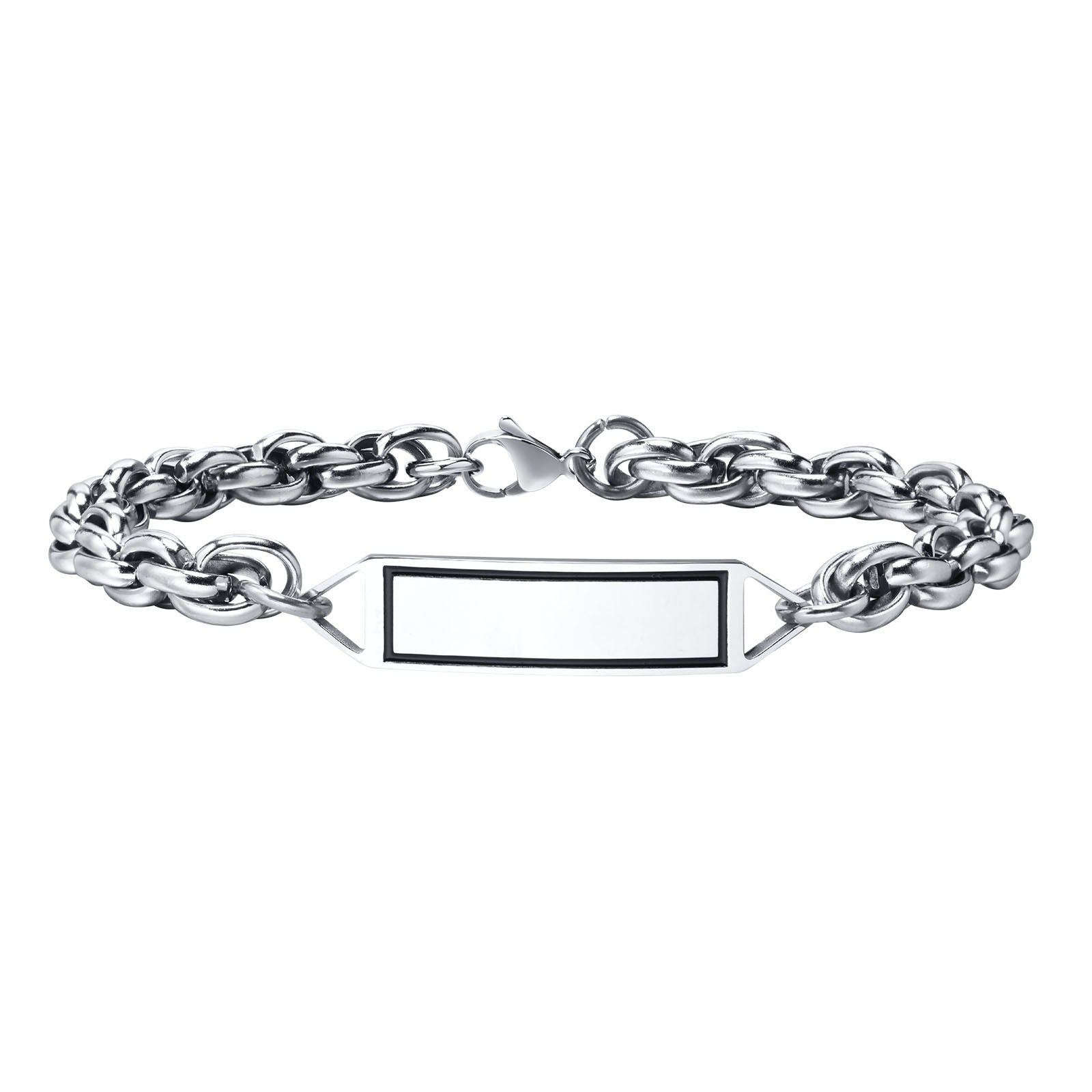 Define your look with this stainless steel ID chain bracelet for men. A framed center plate and solid chain links create clean structure, subtle weight, and confident everyday character.