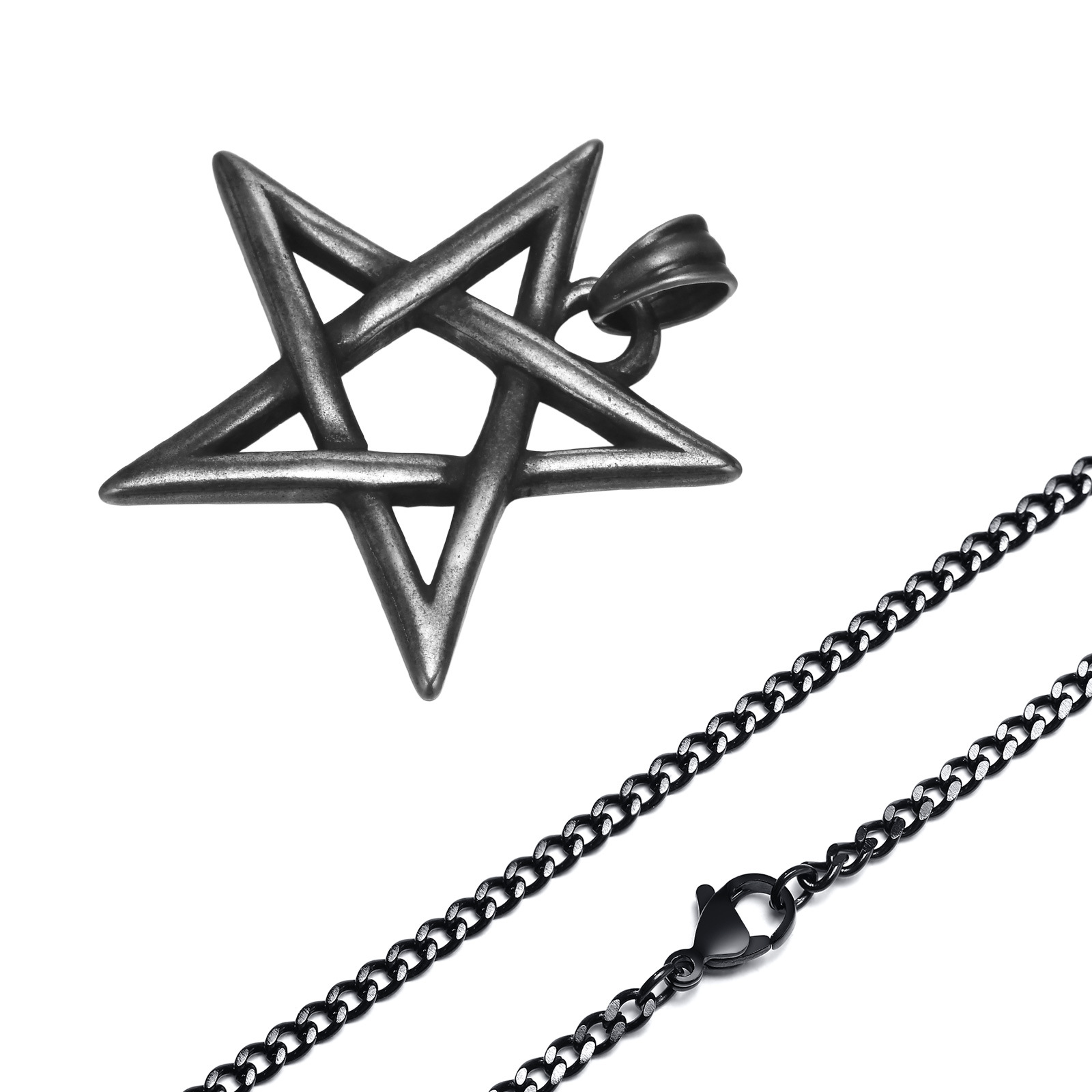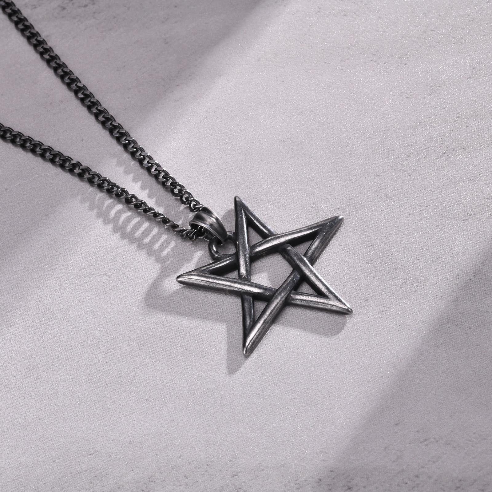 Discover the stainless steel pentagram necklace by a gothic five-point star pendant symbolizing protection, balance, and inner strength. Finished in vintage black for bold, timeless individuality.