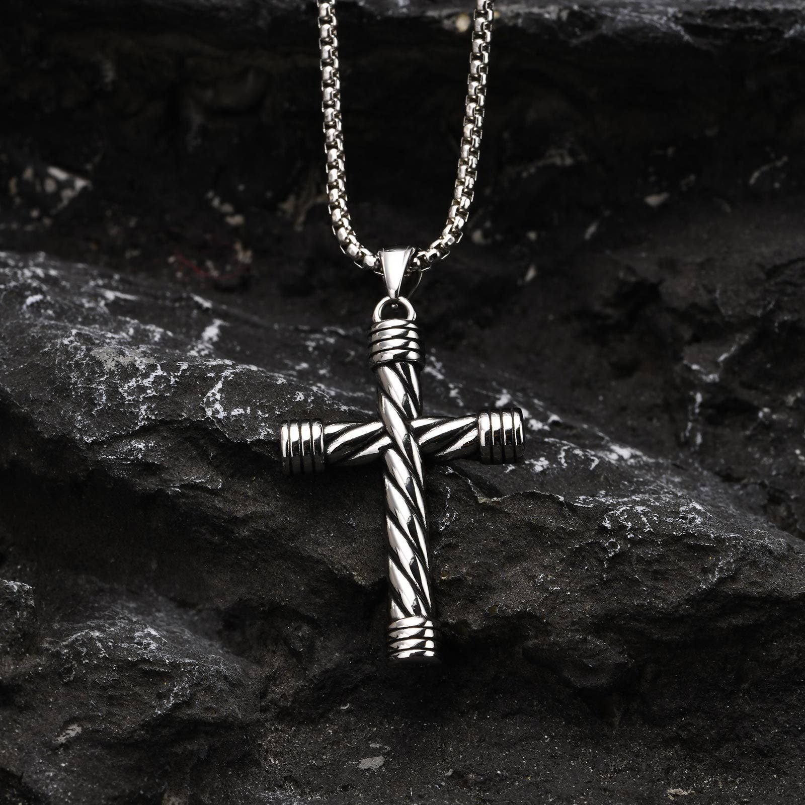 A twisted rope cross that adds depth, clean detailing, and strong masculine appeal to everyday outfits.