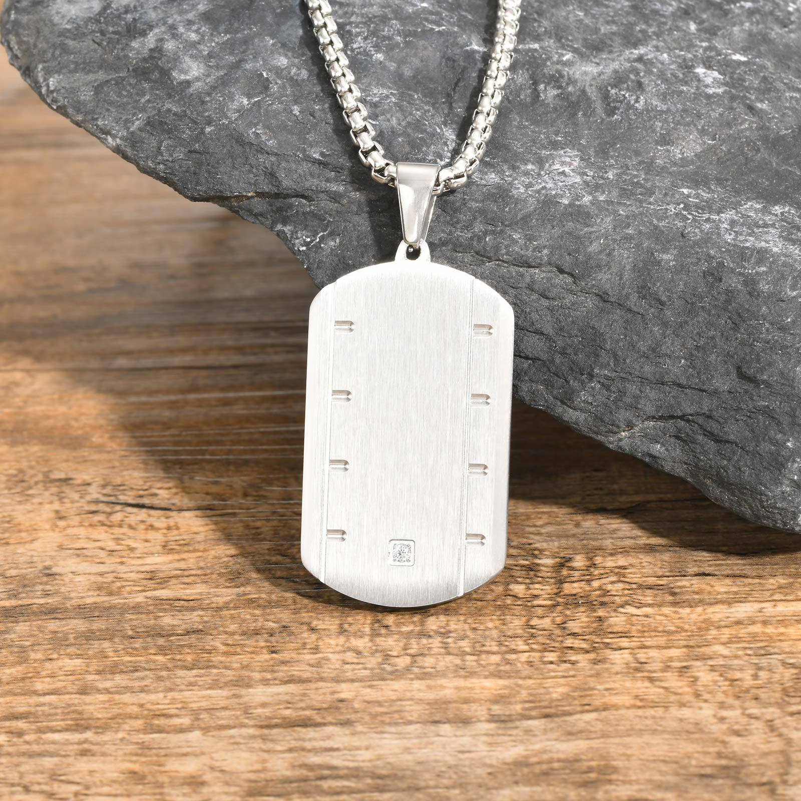 Wear a stainless steel square pendant necklace built with beveled edges and a single Cubic Zirconia detail, delivering clean structure and steady everyday presence.