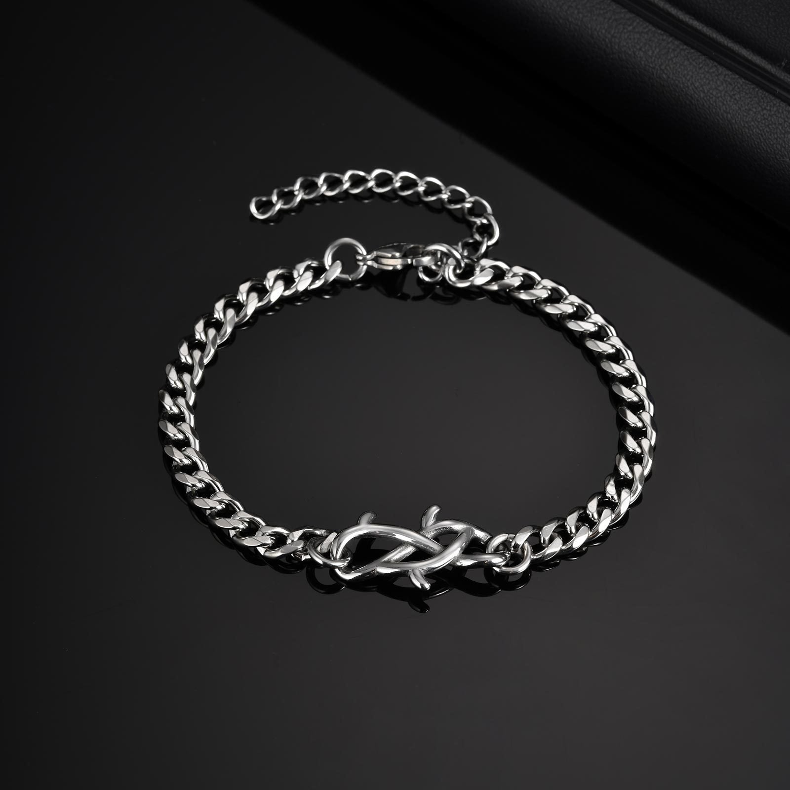 Make a bold statement with this stainless steel thorn link chain bracelet for men, designed with a sleek silver finish. Ideal for men who value unique style, this bracelet combines modern masculinity with timeless elegance.