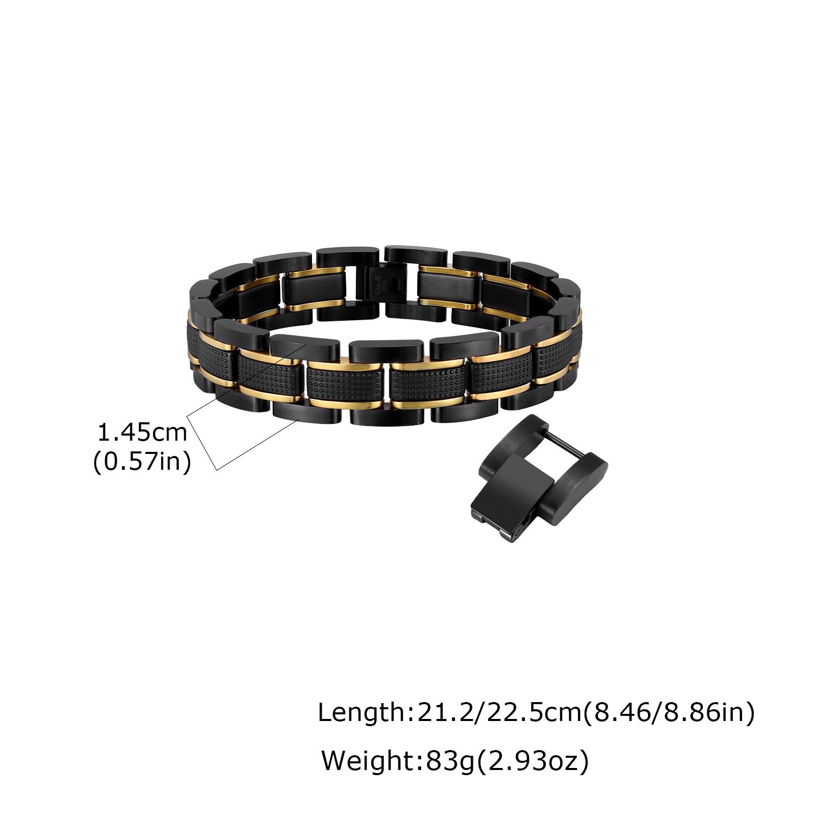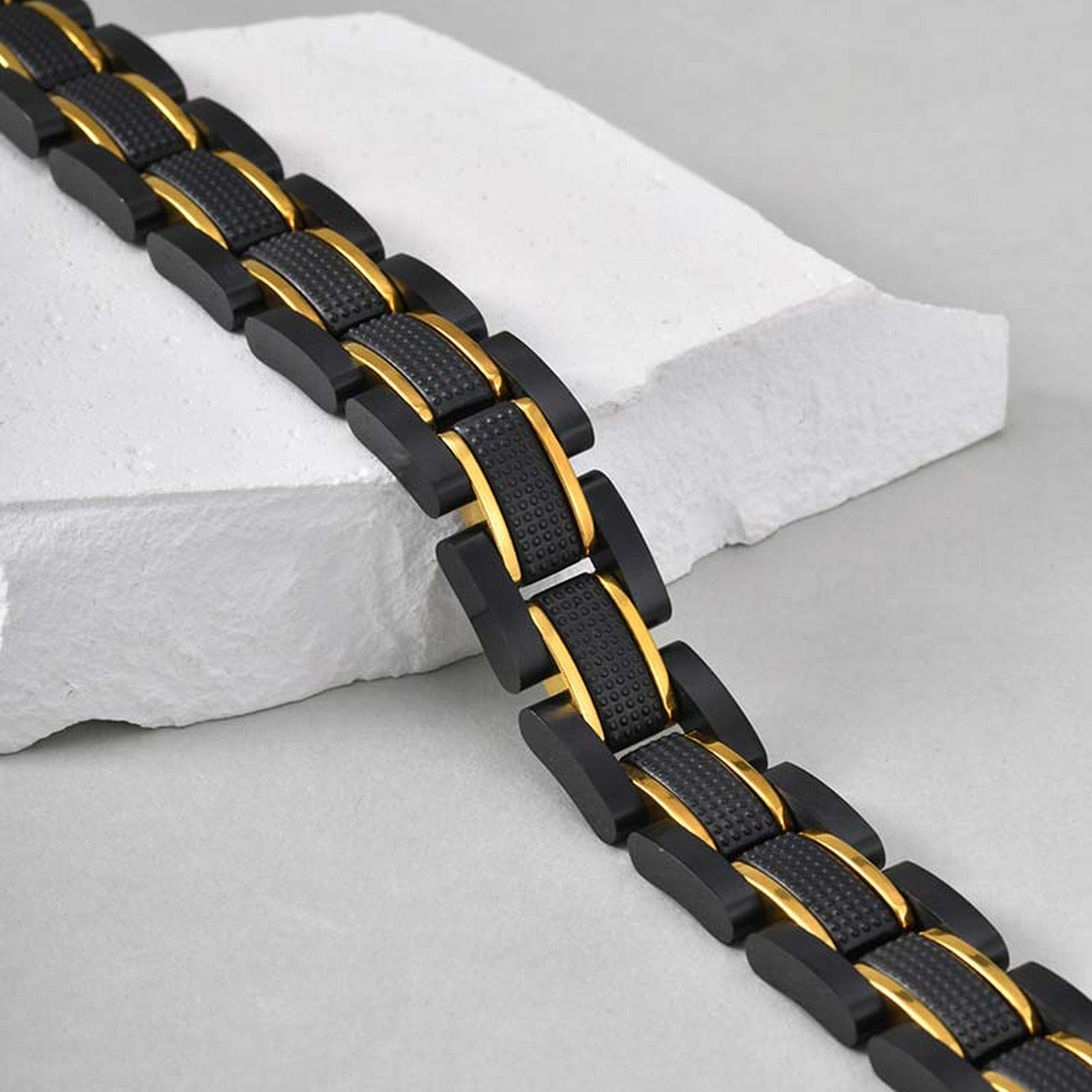 Wear a stainless steel watch band bracelet with black and gold links, balanced weight, and a stable fit that stays centered, whether worn alone or paired with a watch.