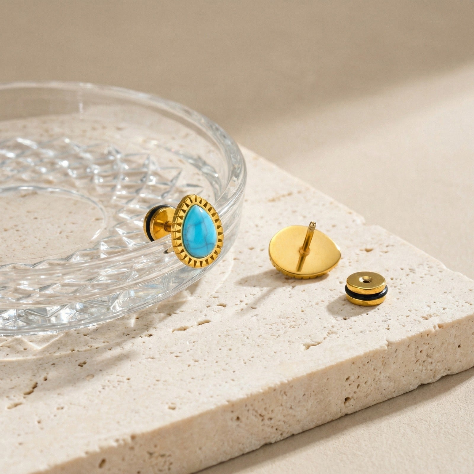 Wear stainless steel turquoise stud earrings designed for men and women. Teardrop shape and gold plated frame add clean contrast, focus, and everyday presence.