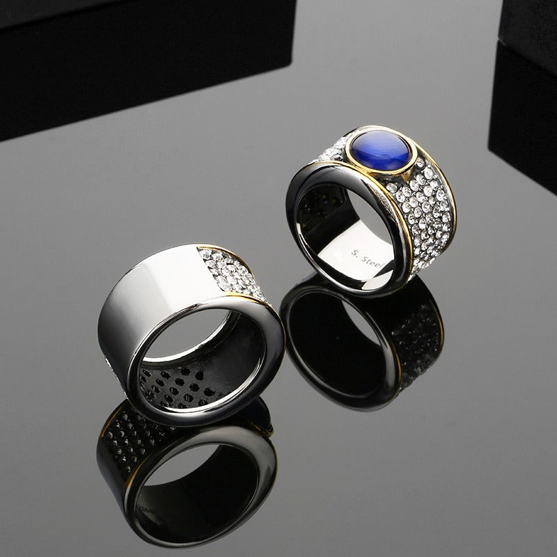 A blue cat eye stone paired with rhinestone accents creates confident presence and everyday visual impact.