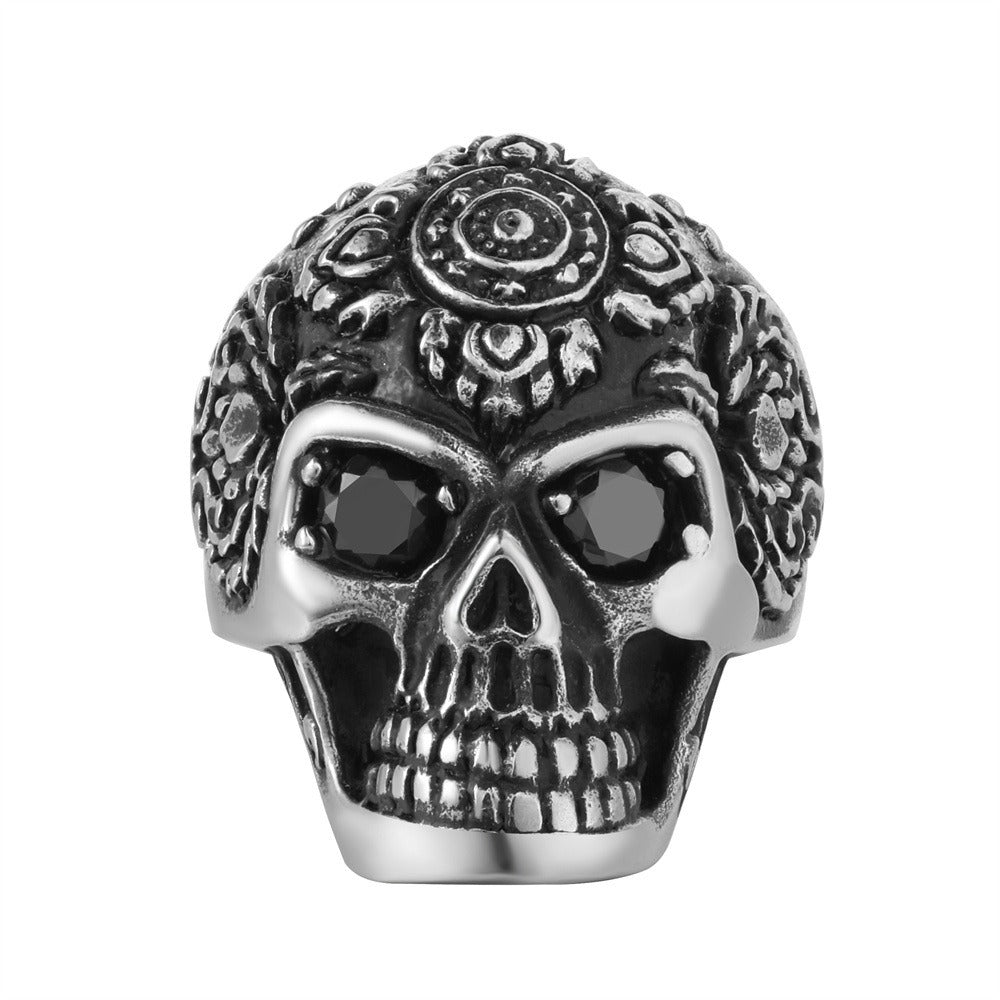 Kemstone Titanium Steel Skull Ring with Cubic Zirconia Eyes – Gothic Carved Design R1780