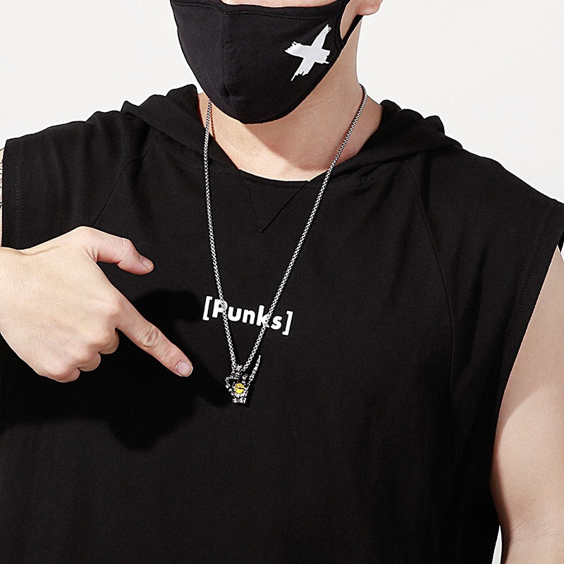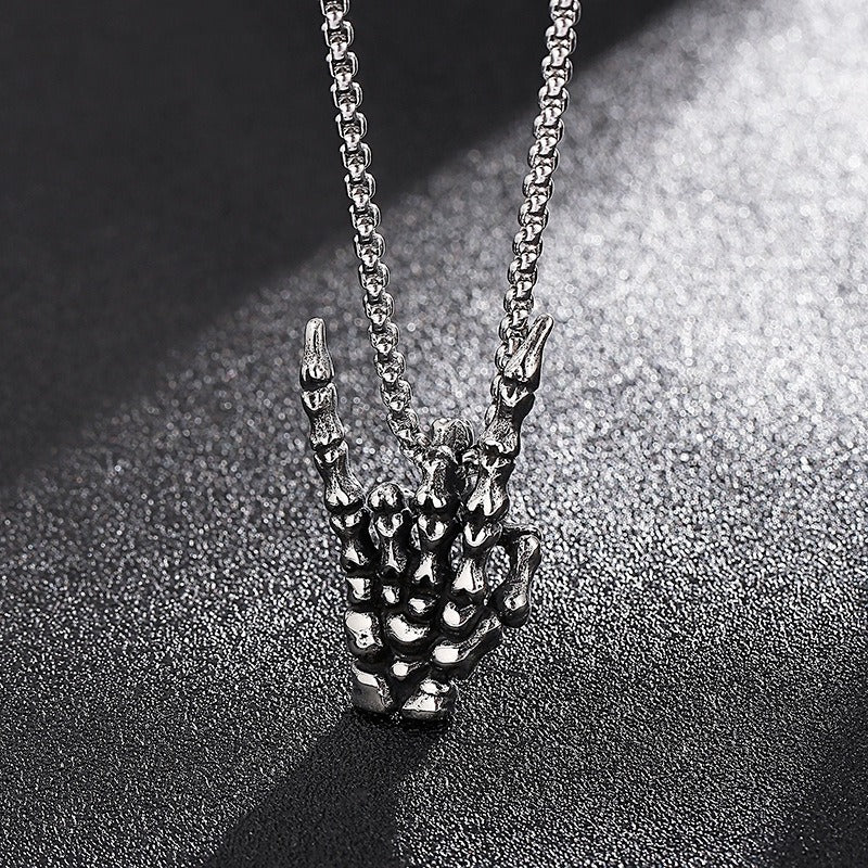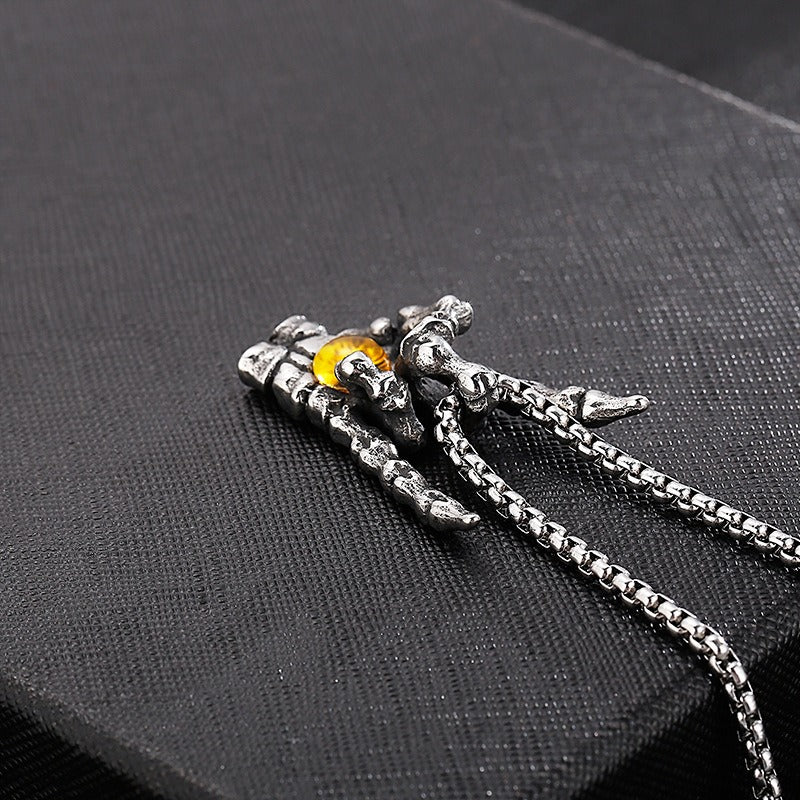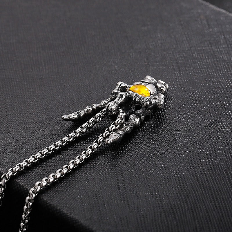 Show your strength with this men’s titanium steel victory-hand pendant. A carved skeletal hand holding a tiger eye stone adds meaning, texture, and confident daily energy.