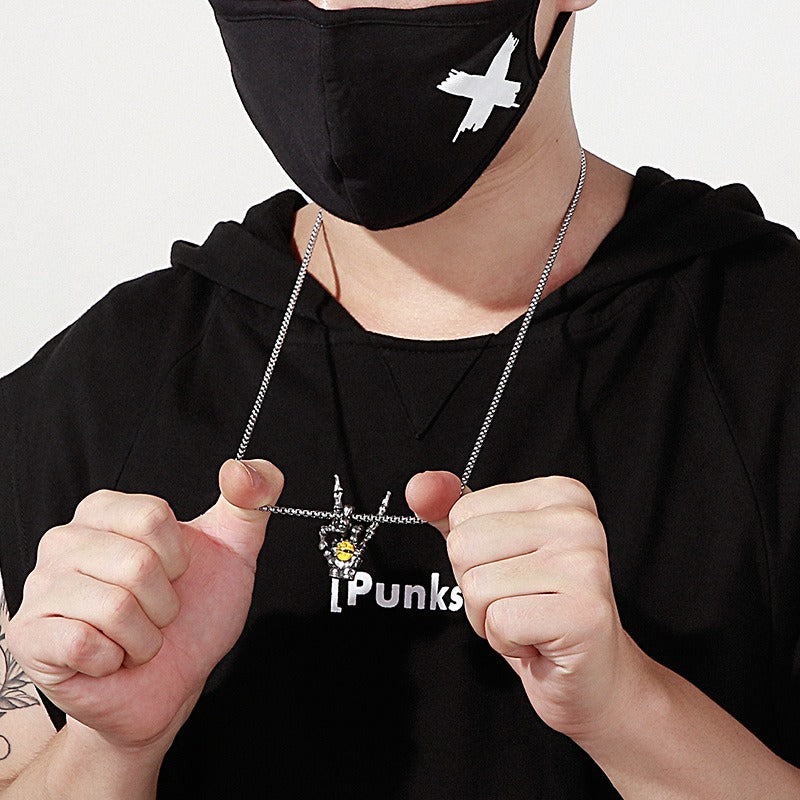 The raised skeletal hand reflects rebellion, strength, and a bold sense of triumph.