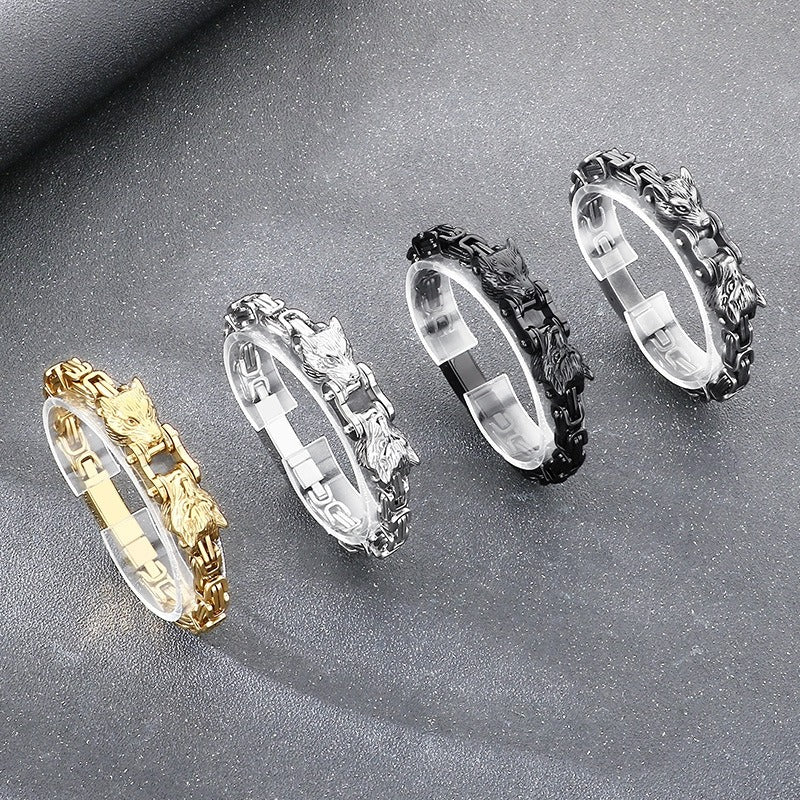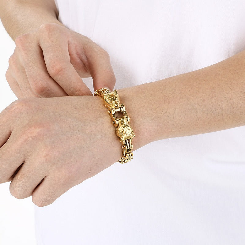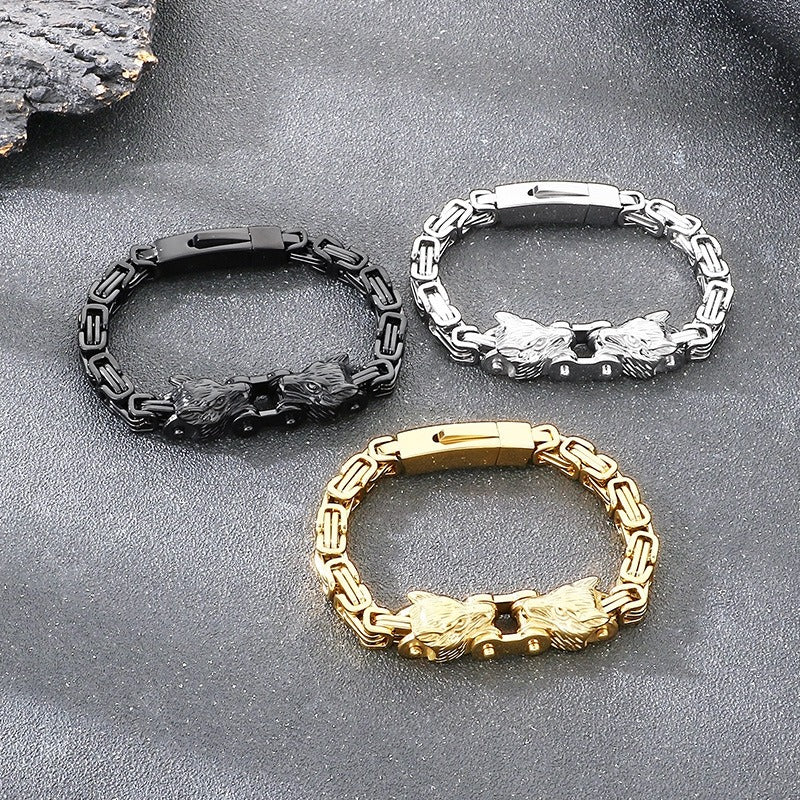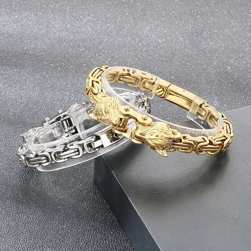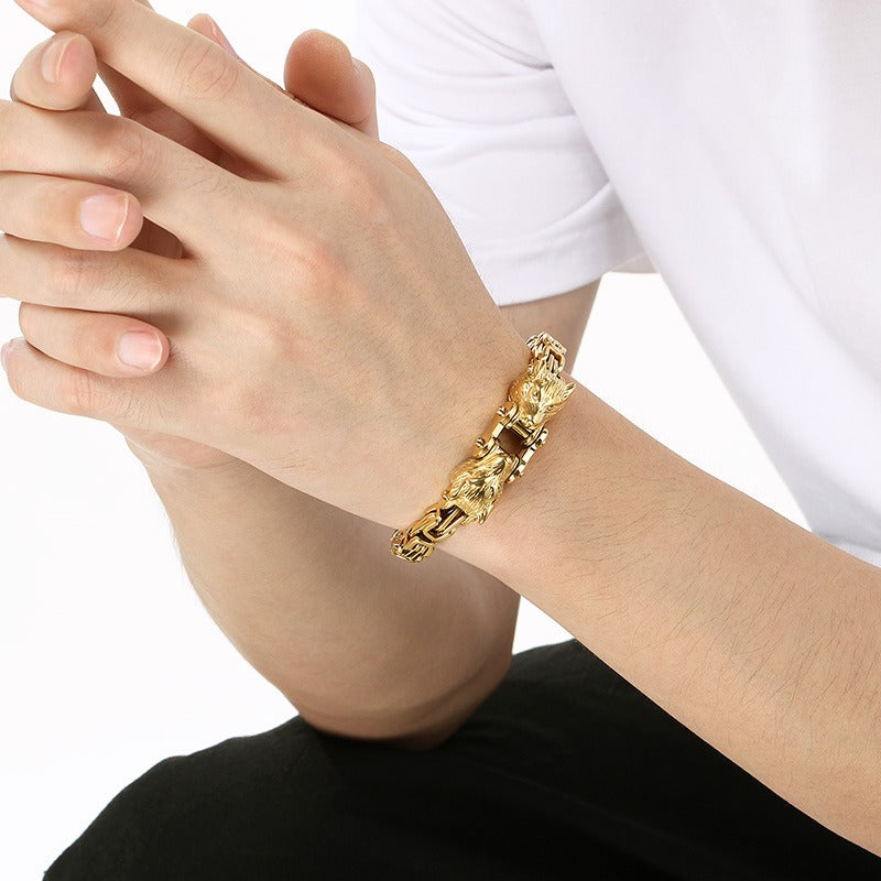 Claim your power with this titanium steel men’s wolf head biker bracelet. Sculpted twin wolves, a bold emperor-chain design, and a magnetic clasp bring strength and daily confidence.