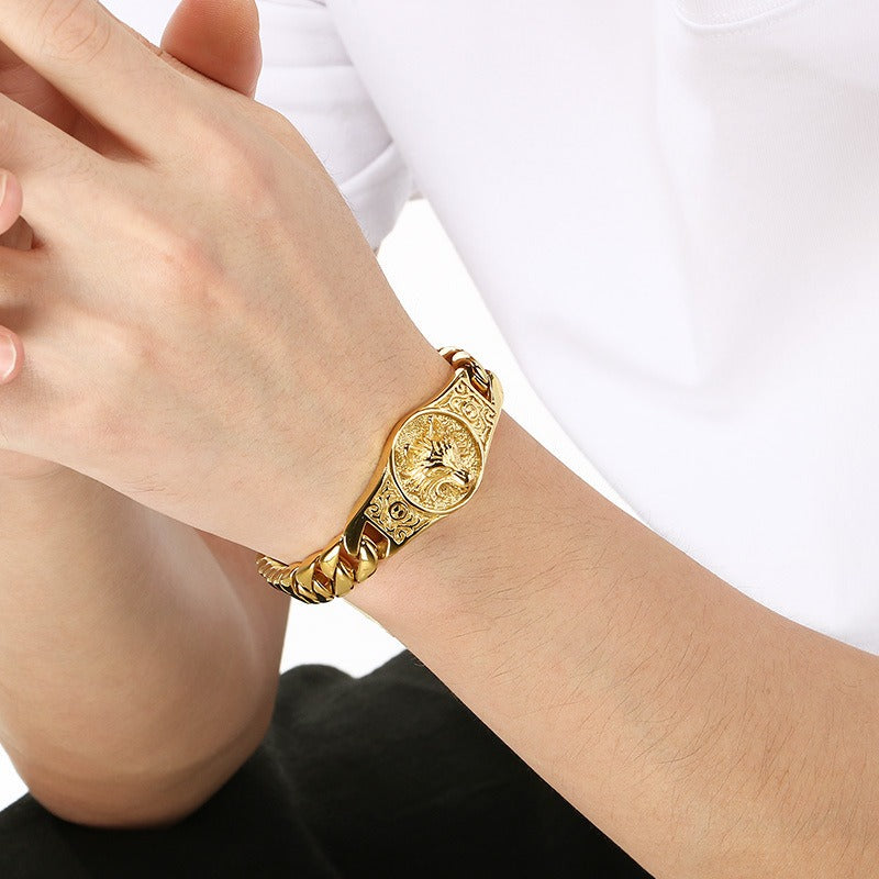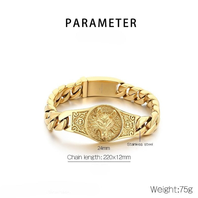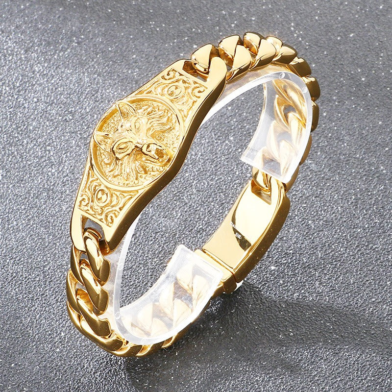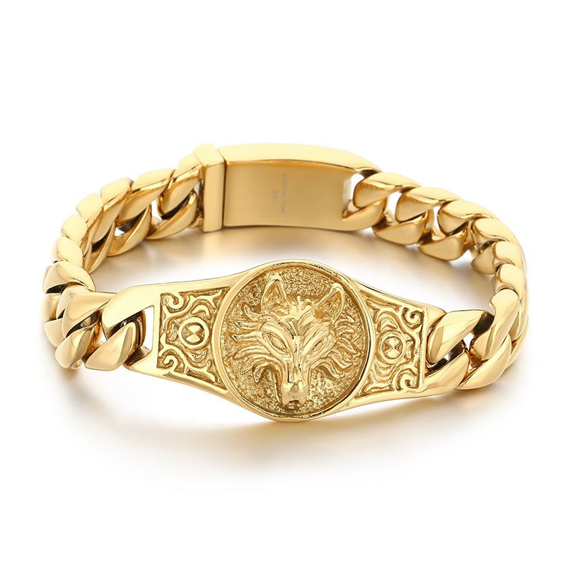 Command strength and style with this men’s titanium steel wolf head bracelet. A bold Cuban chain and fierce wolf charm create a fearless look made for leaders.