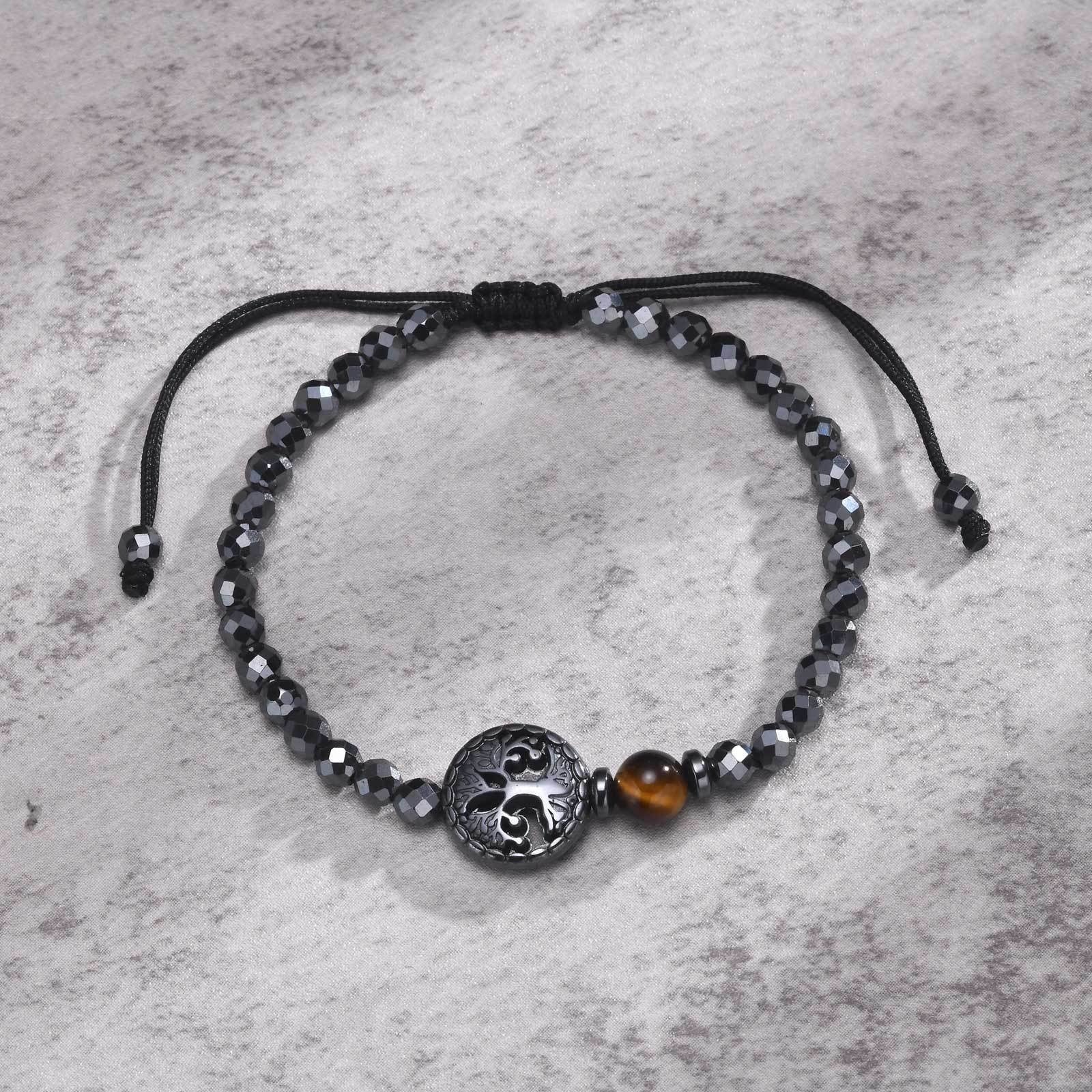 Wear this Tree of Life tiger eye beaded bracelet for men and feel the faceted hematite and smooth stone rest evenly on the wrist, forming a centered structure with calm balance and steady presence.