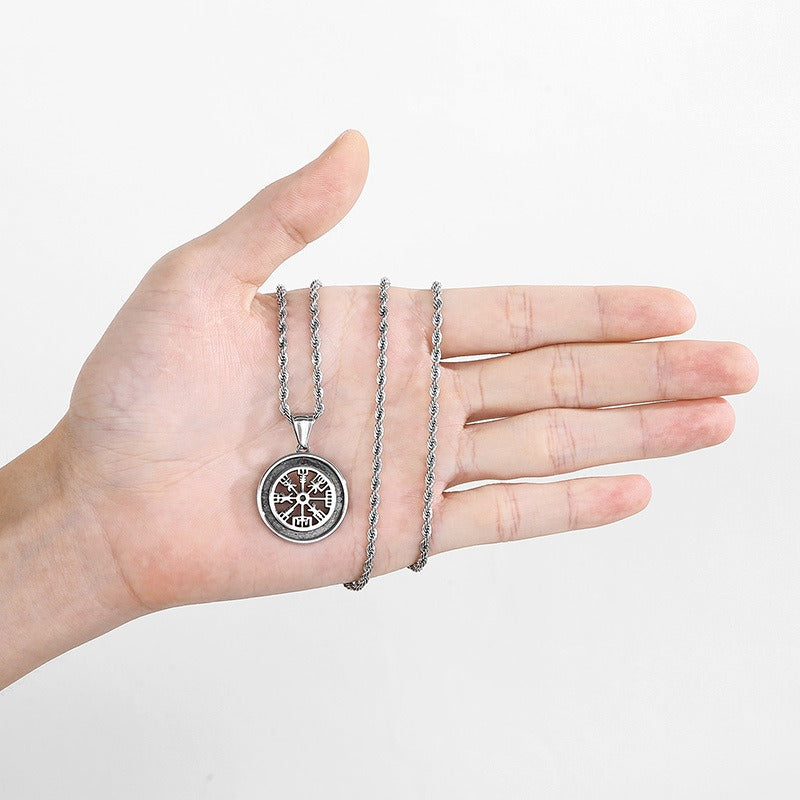 A titanium steel Viking rune compass pendant necklace inspired by Norse symbols, designed to express direction, purpose, and confident everyday wear.