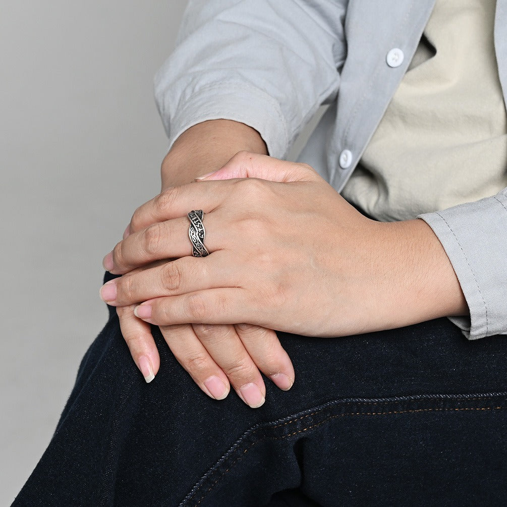 Wear grounded symbolism with this stainless steel Viking rune ring, shaped with interwoven knot lines. The balanced band feels steady, textured, and natural for everyday wear.