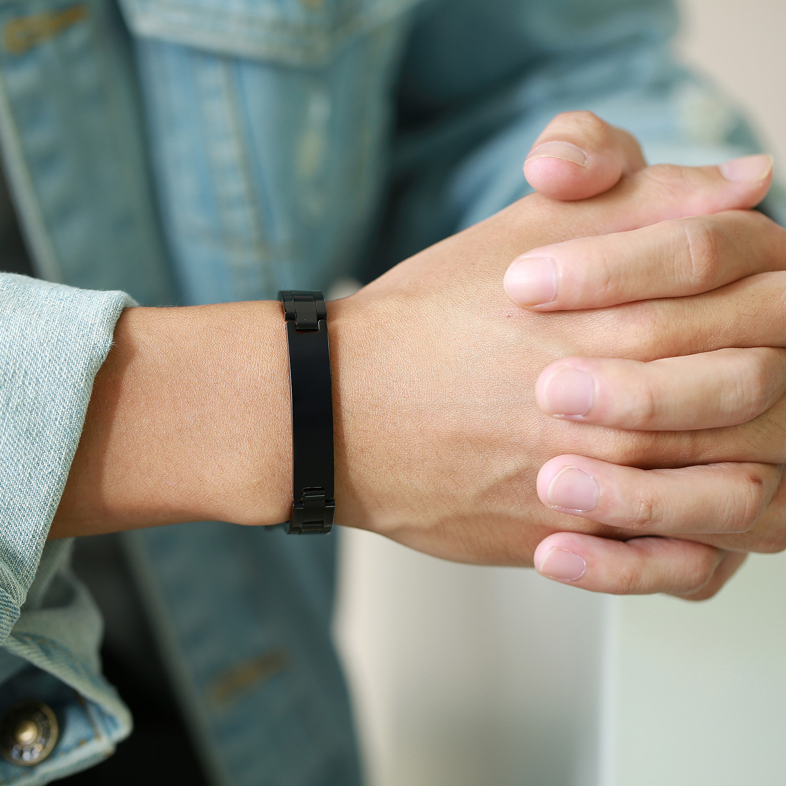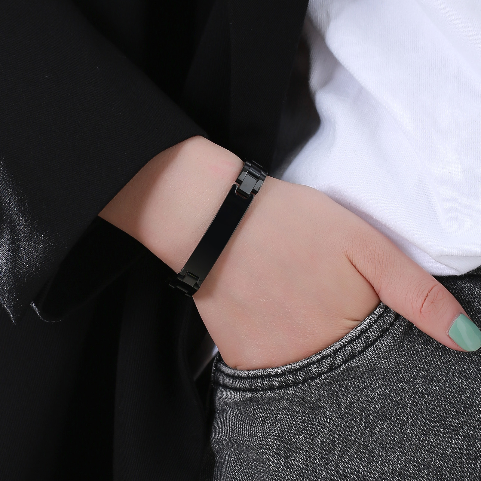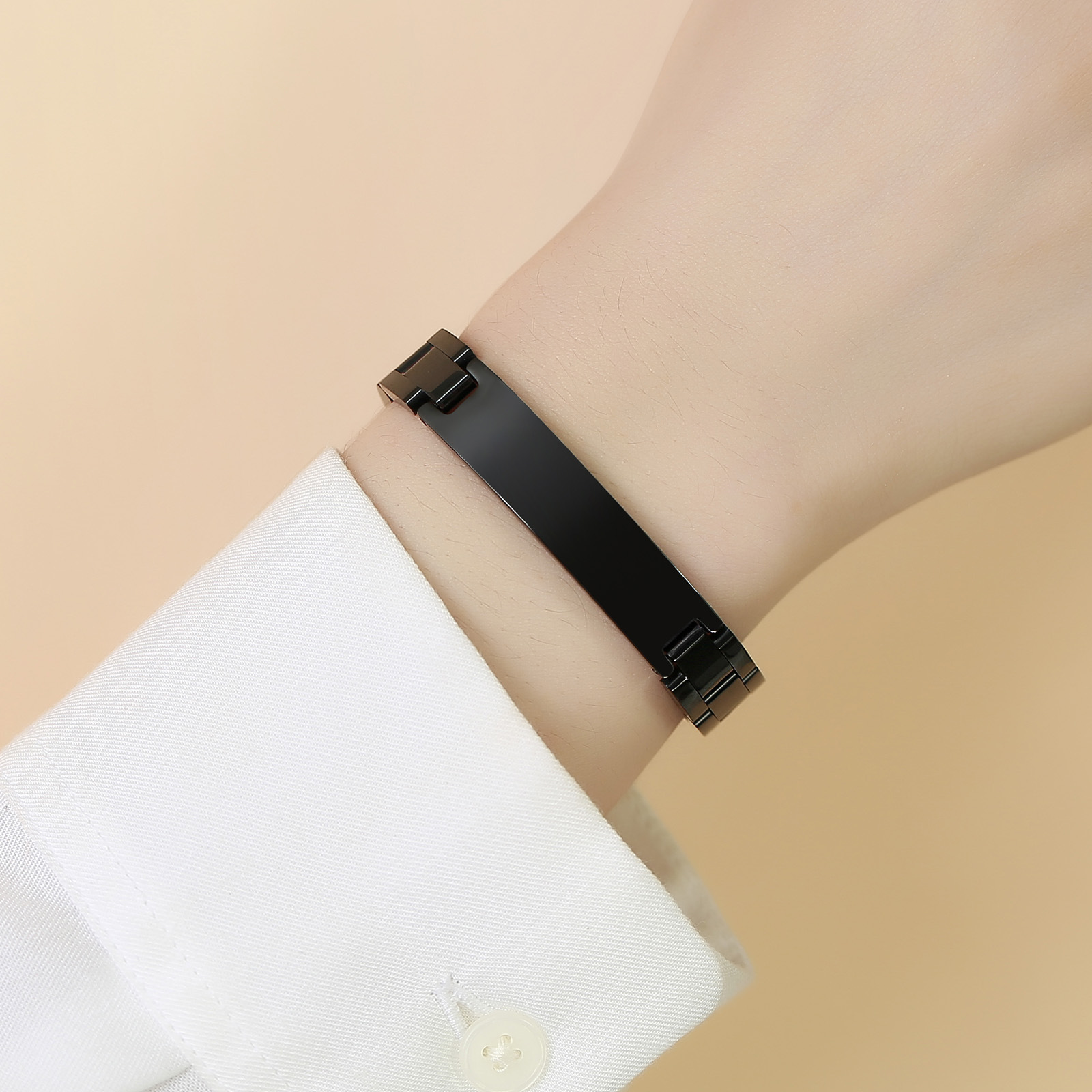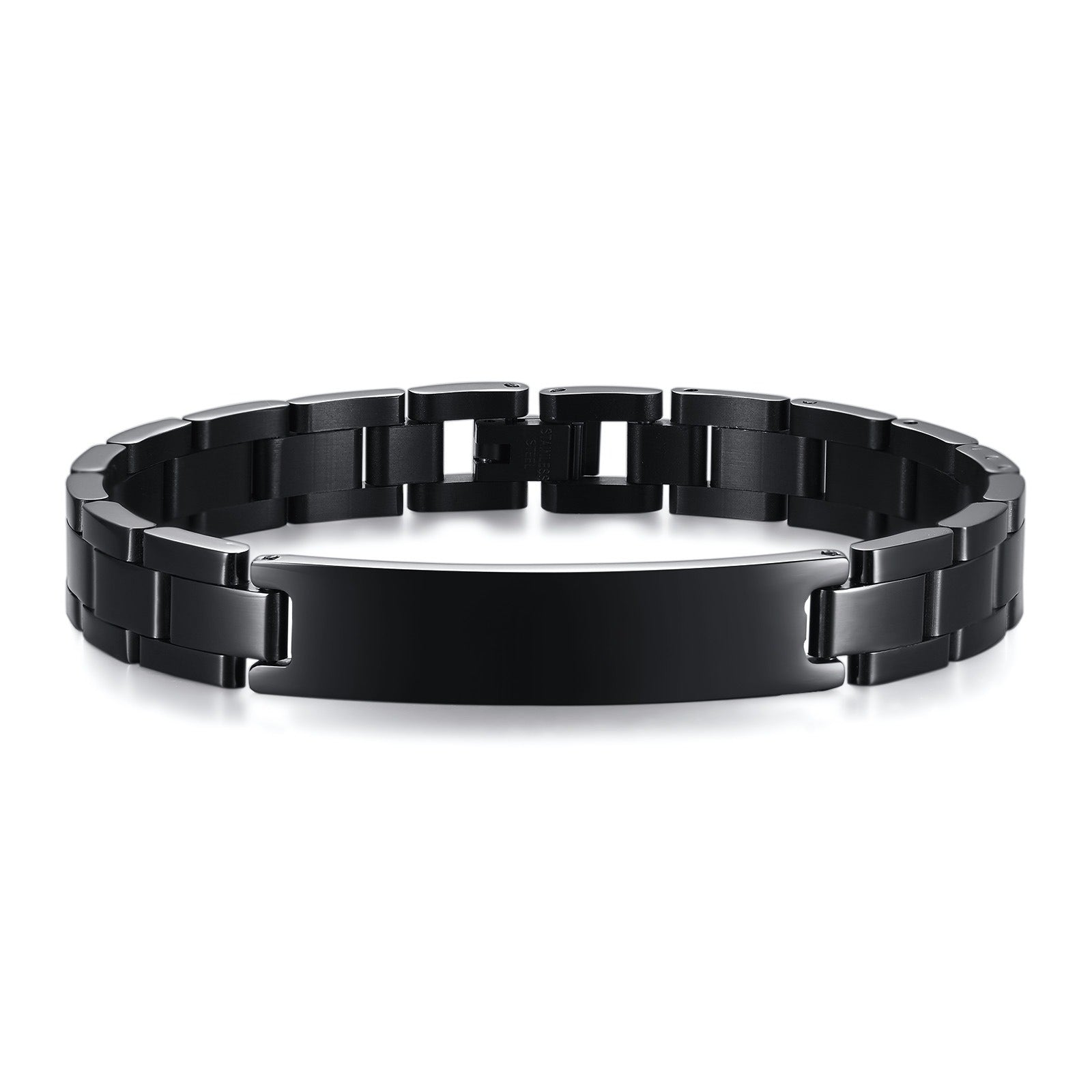 Wear this black stainless steel ID link bracelet and feel the curved nameplate rest flat and centered on the wrist, delivering balanced weight, clean structure, and a steady, composed presence for everyday wear.