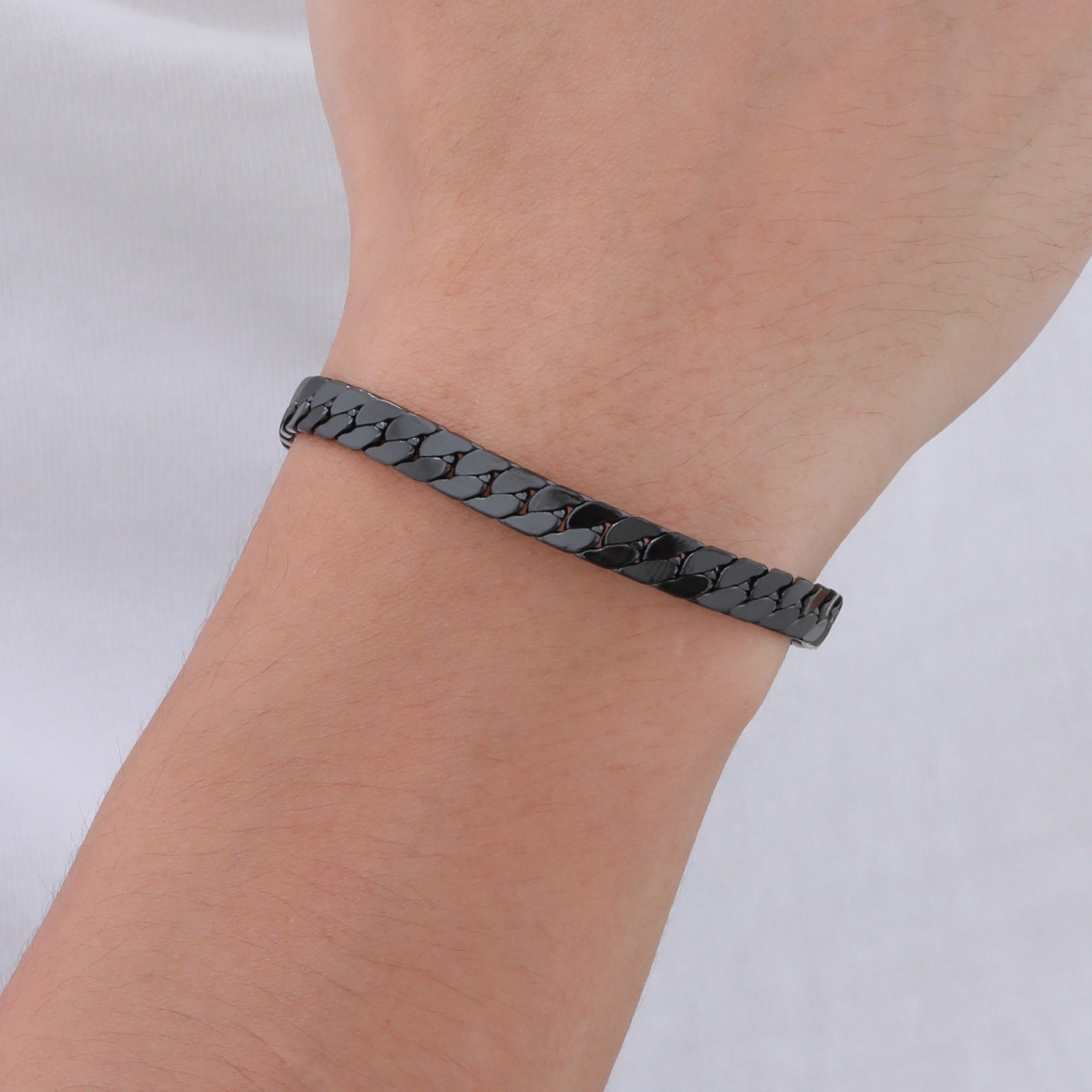 Minimalist men’s stainless steel bracelet. Flat NK chain design, silver, gold, and black options. Adjustable 18–23 cm, lightweight 11 g.