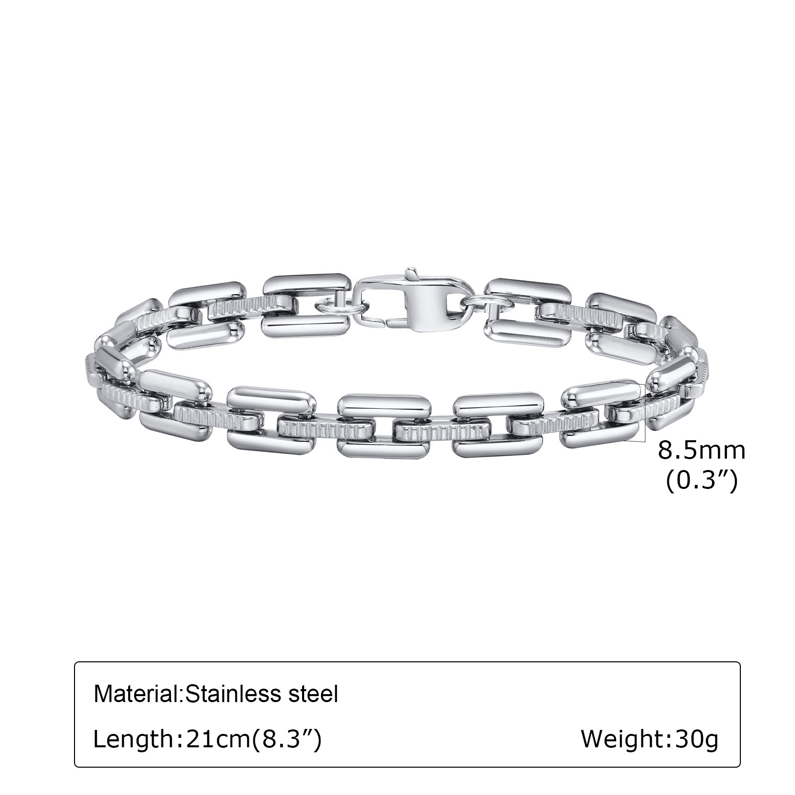 Rectangular metal links connect in a clean geometric pattern.