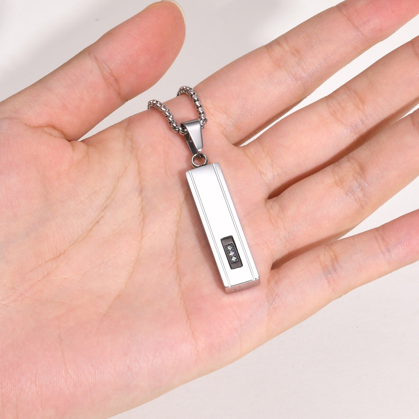 Define clean vertical presence with a men’s stainless steel bar pendant, centered on the chest, subtle cubic zirconia, balanced weight, calm modern control.