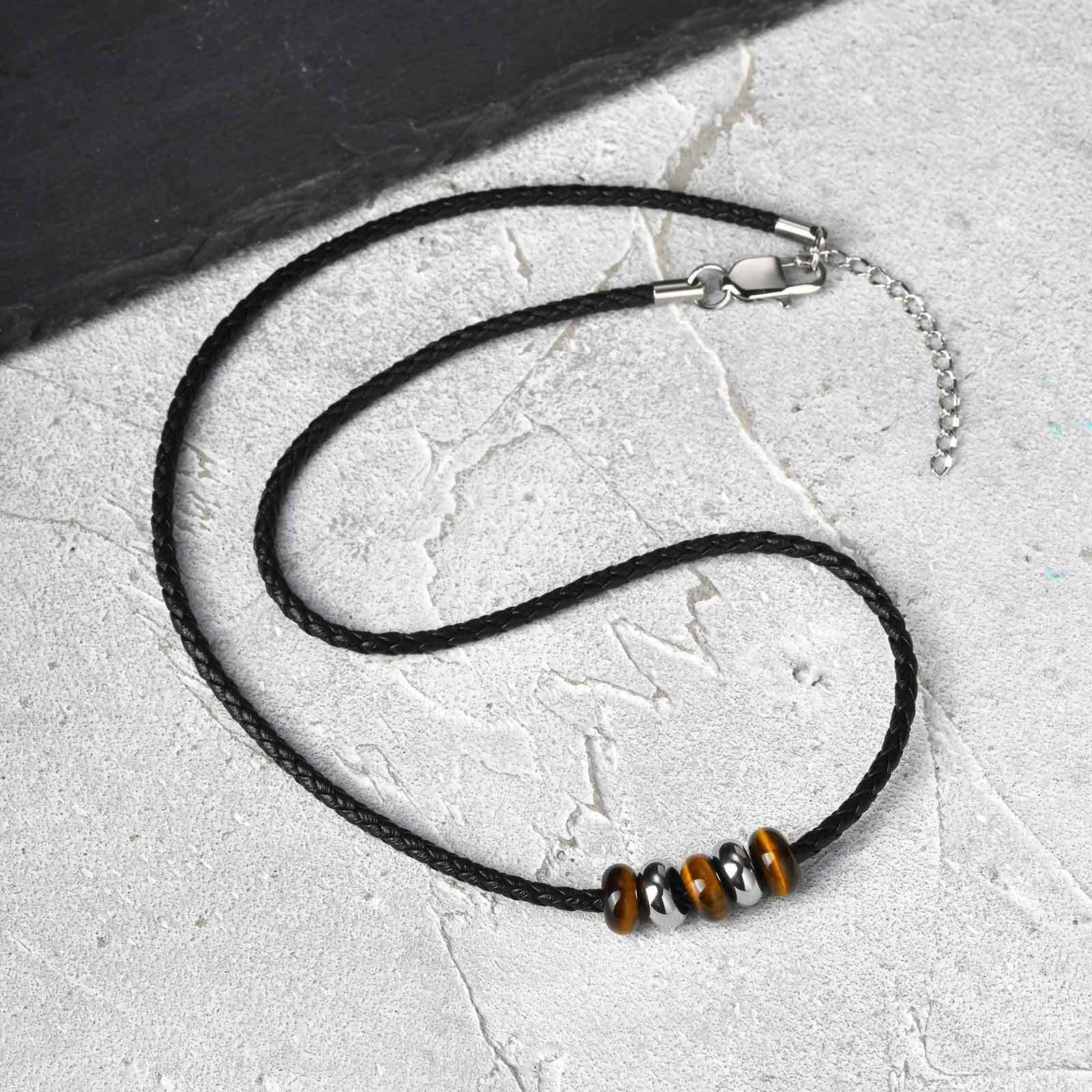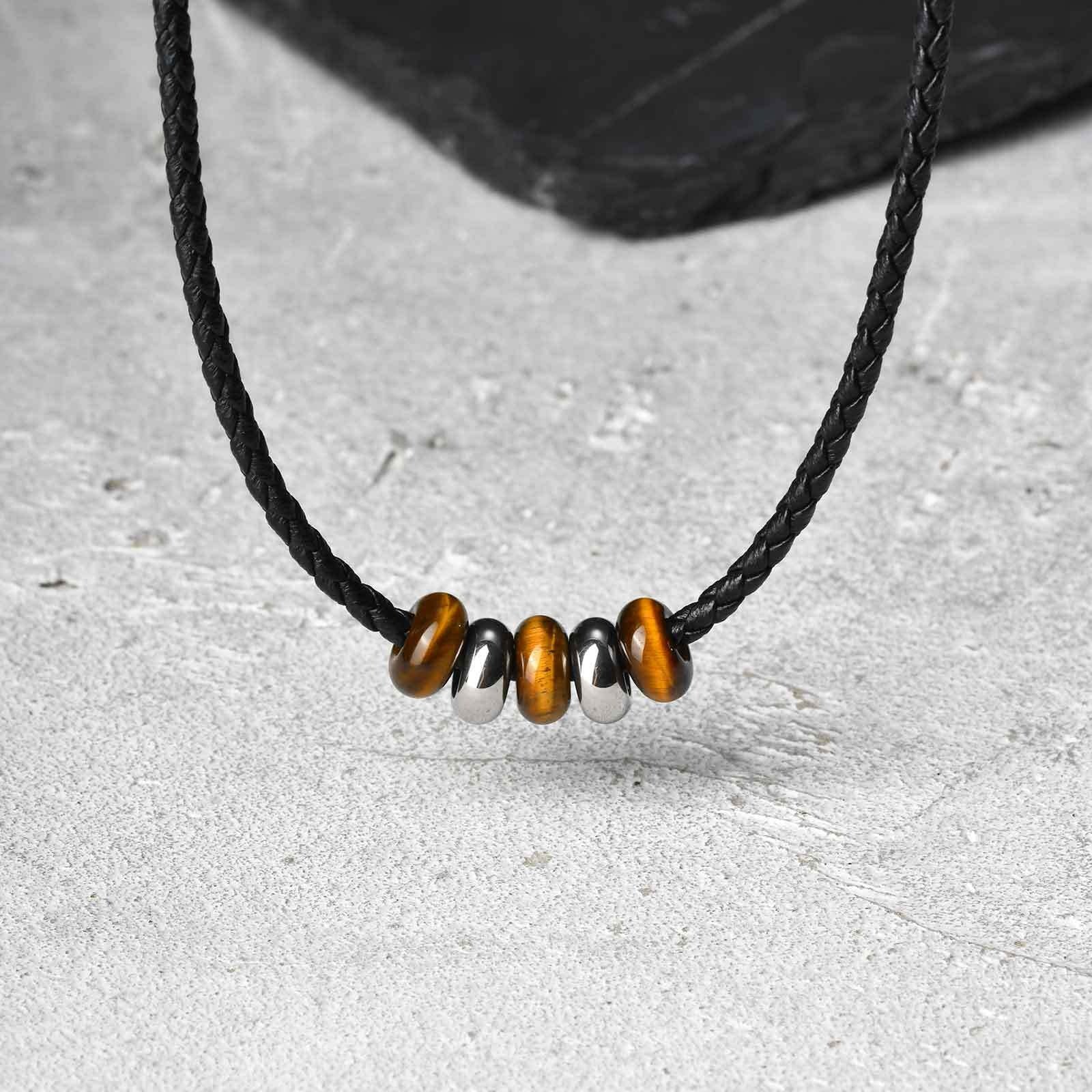 Wear this PU leather necklace for men with tiger eye beads and stainless steel accents. A versatile accessory symbolizing confidence, balance, and modern style.