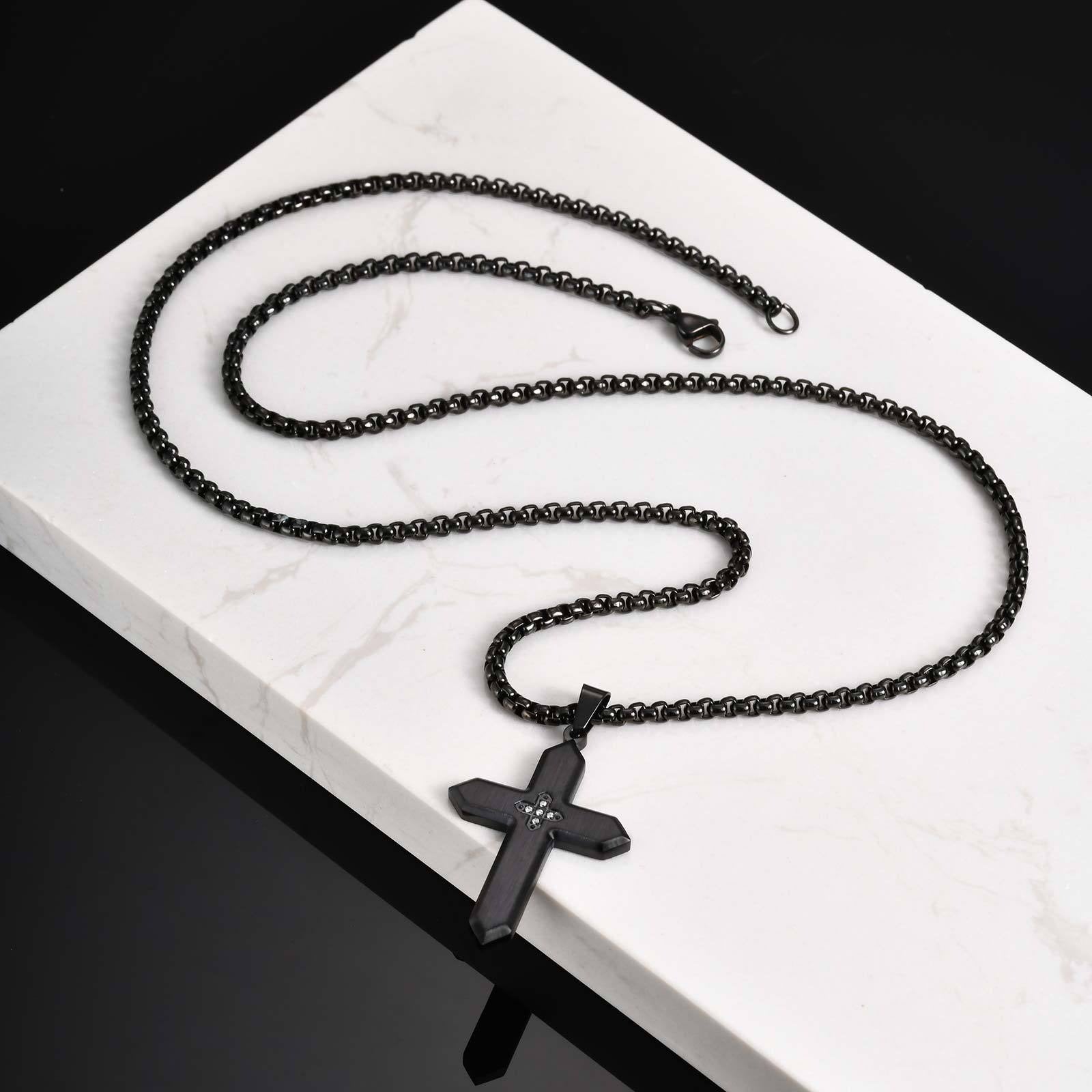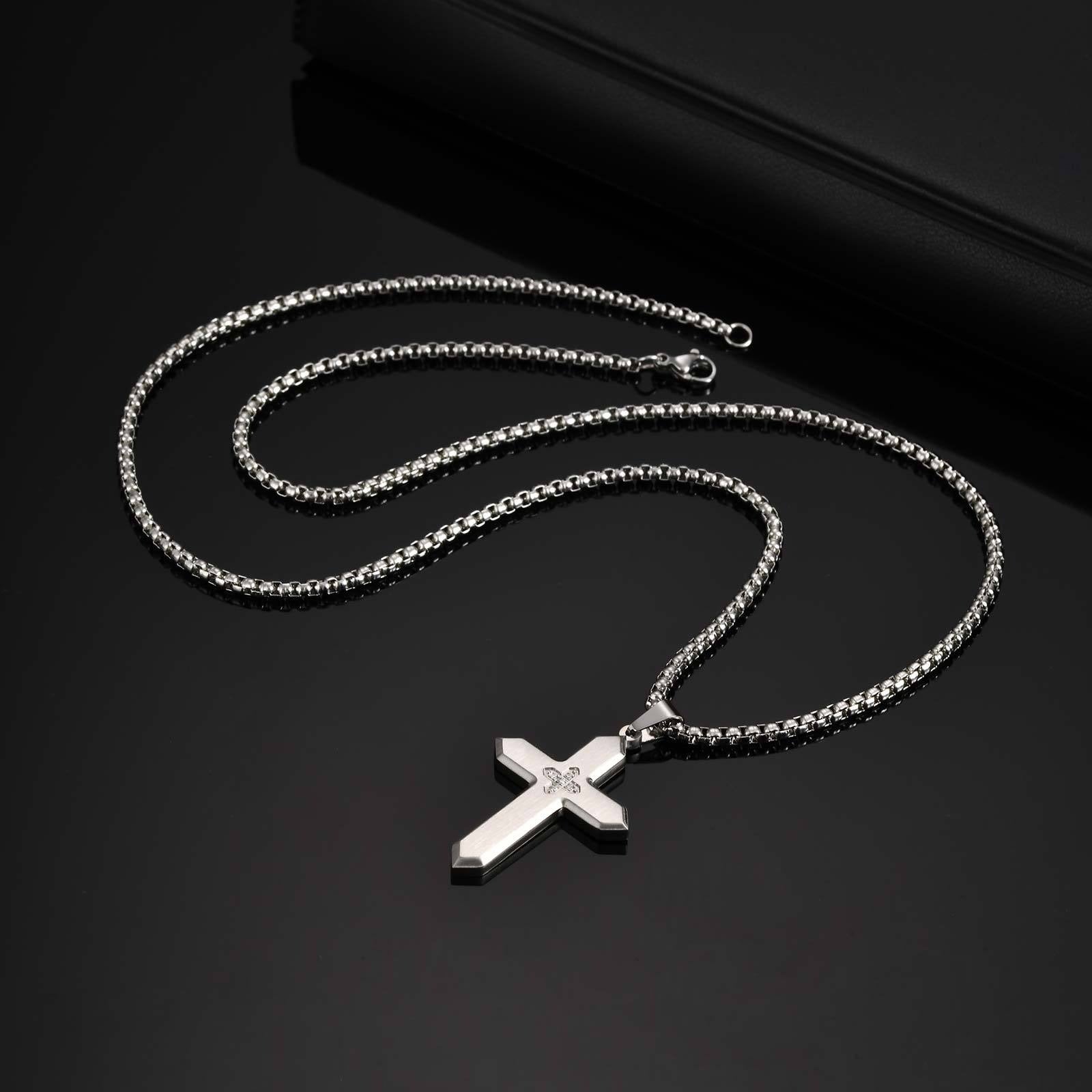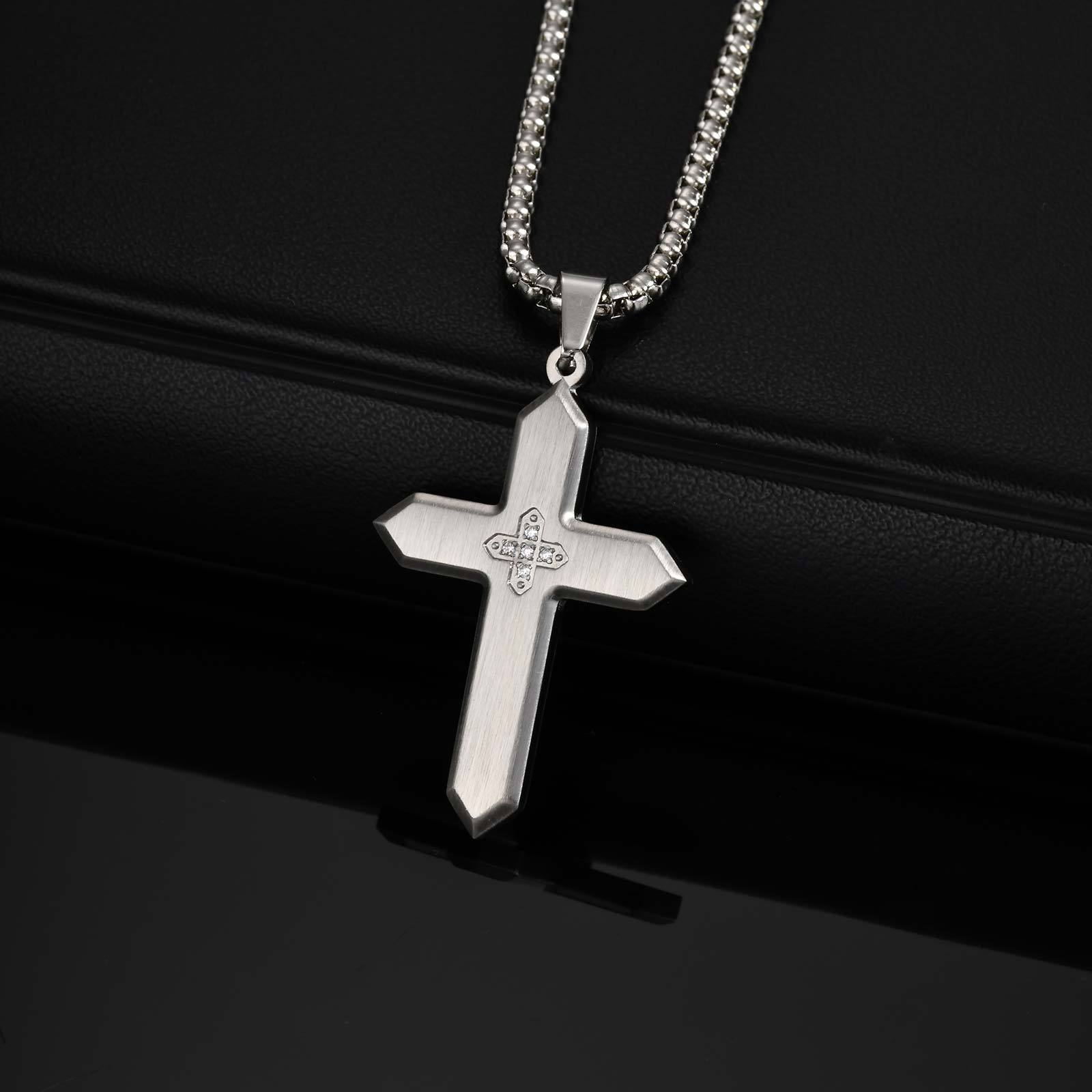 Kemstone Stainless Steel Brushed Cross Pendant Necklace with Cubic Zirconia – Square Link Chain for MenPN-2198