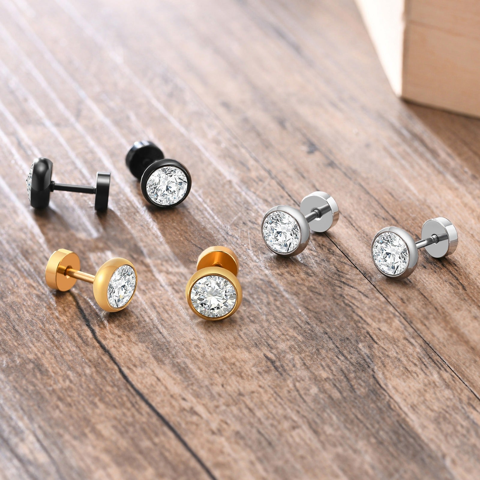 Kemstone Men’s CZ Stud Earrings – Stainless Steel Minimalist Jewelry, Silver/Gold/Black ES-332