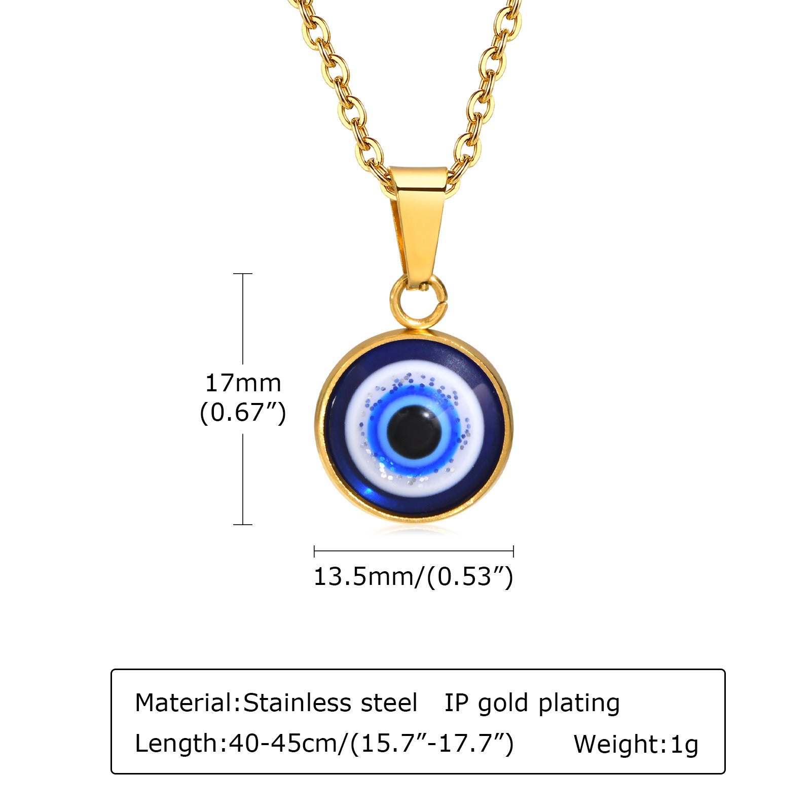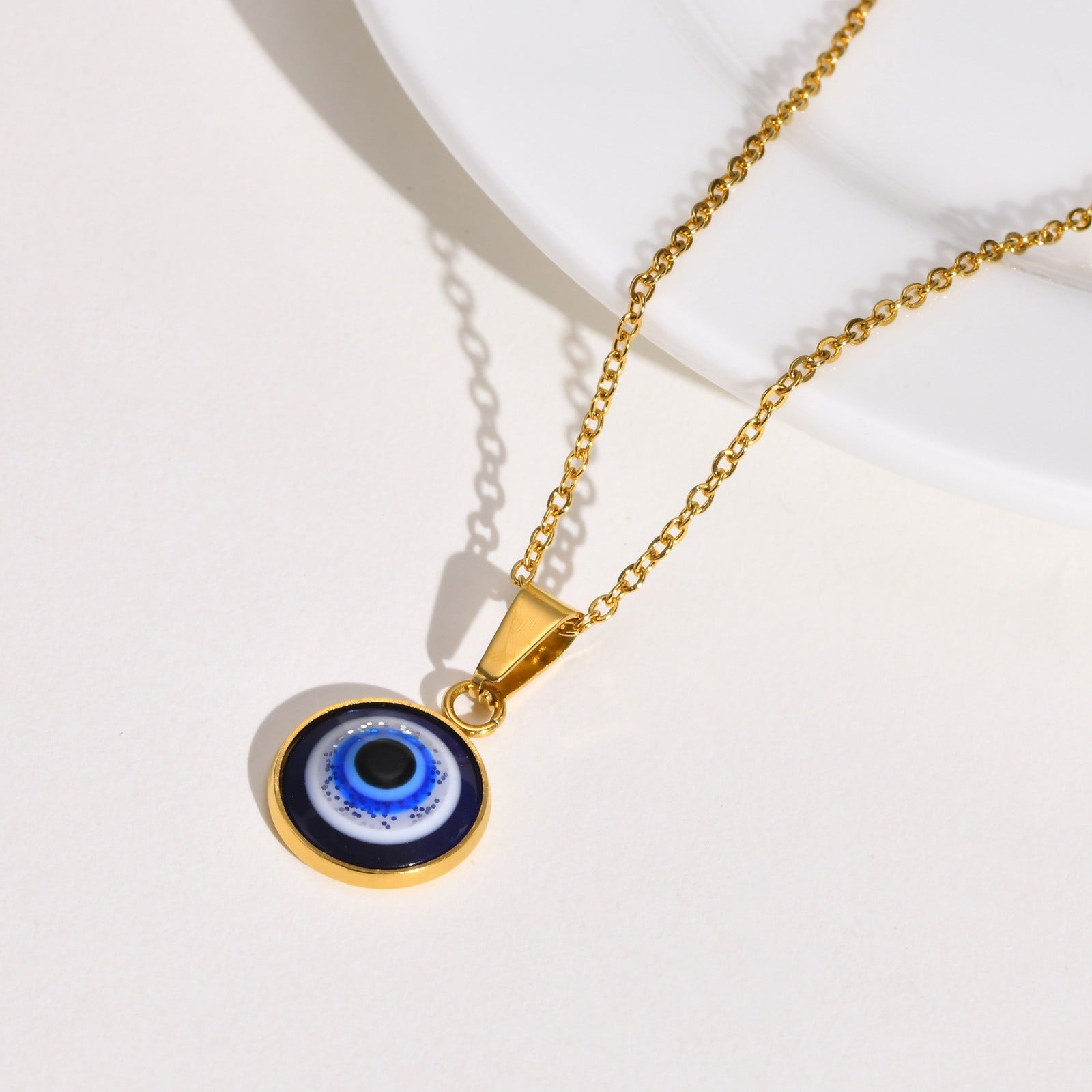 A unisex evil eye necklace in stainless steel. Choose gold or silver, lightweight 1 g, adjustable 40–45 cm chain. A charm of luck, style, and protection.