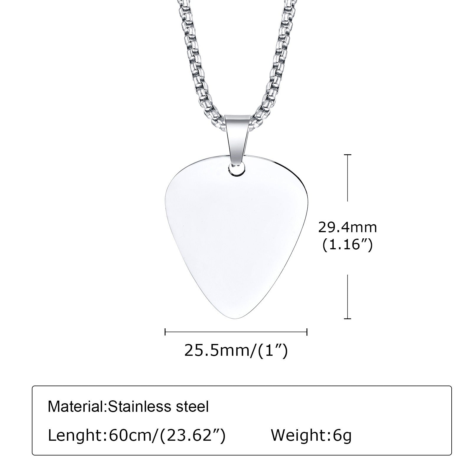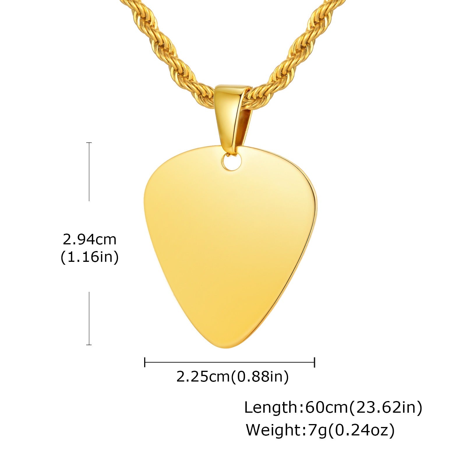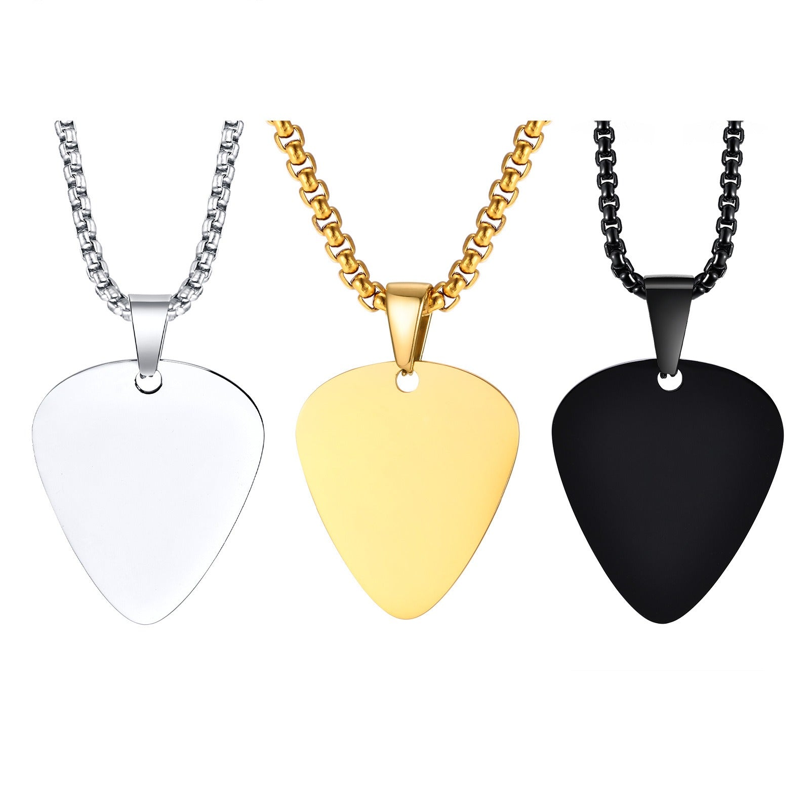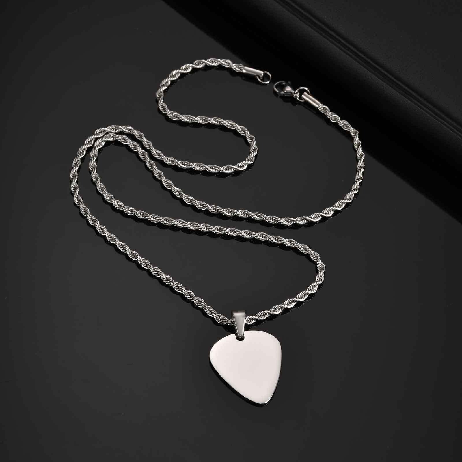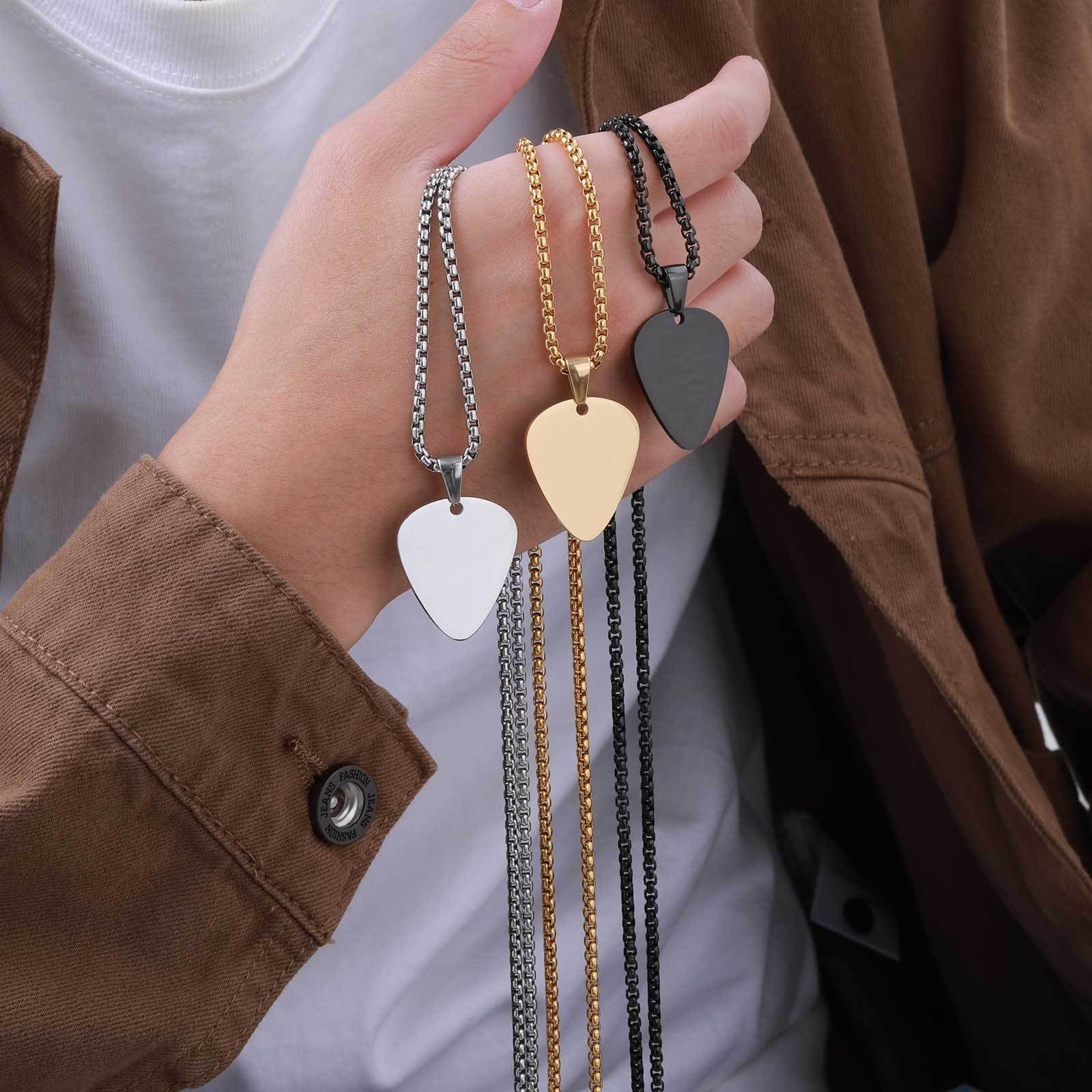 Stainless steel guitar pick pendant necklace for men. Available in gold, silver, and black. 60 cm chain, 6 g lightweight build, perfect for music lovers.