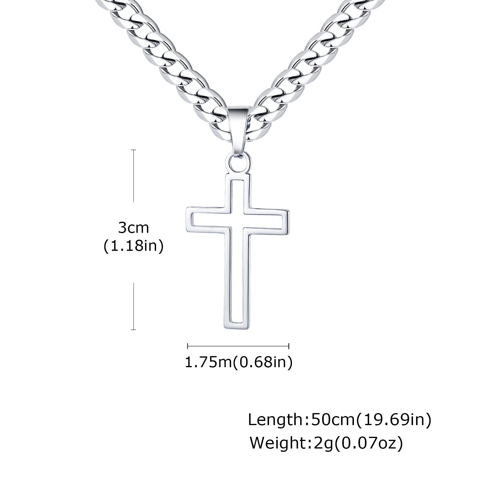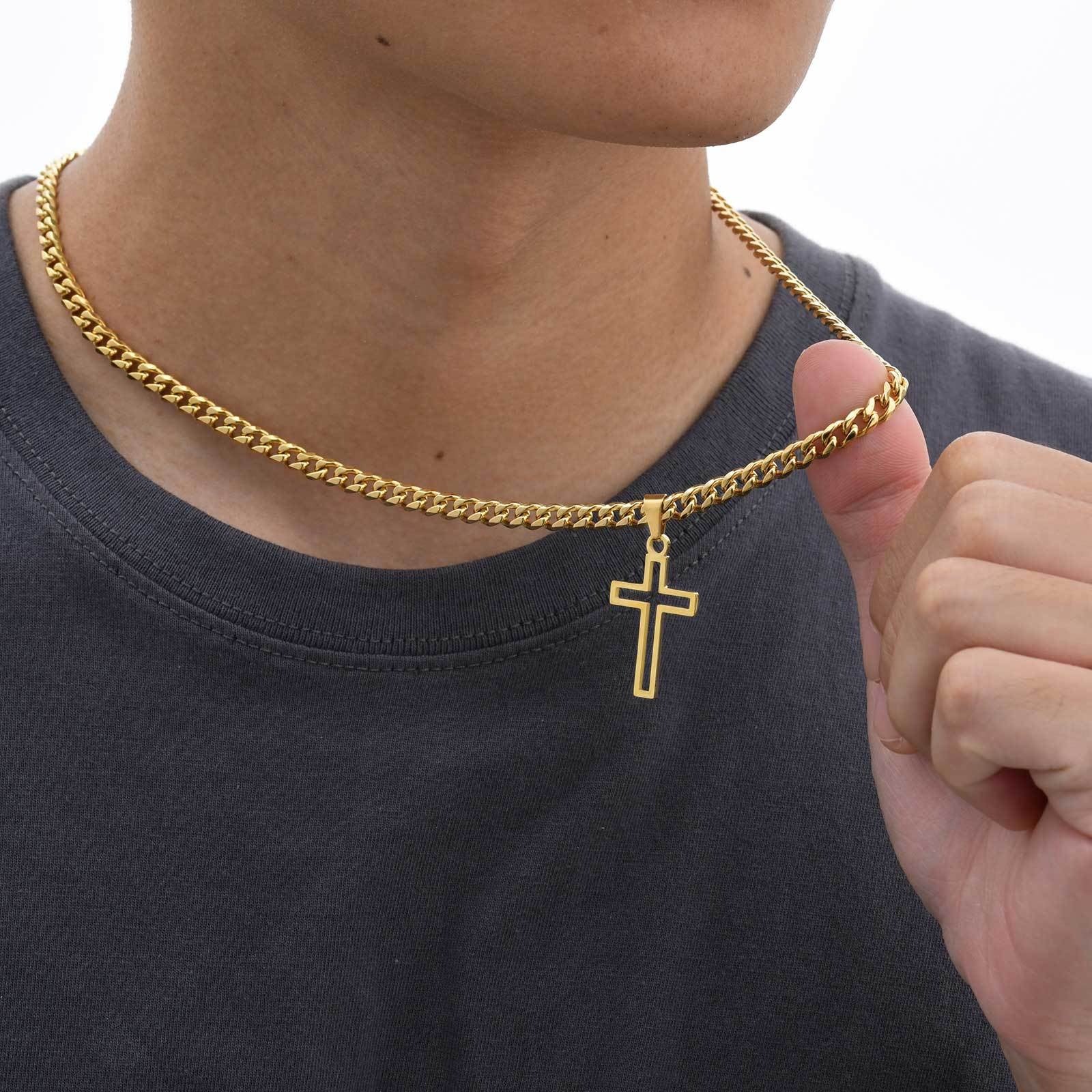 Pair the cross with a sturdy Cuban link, perfect for streetwear, biker looks, or casual outfits.