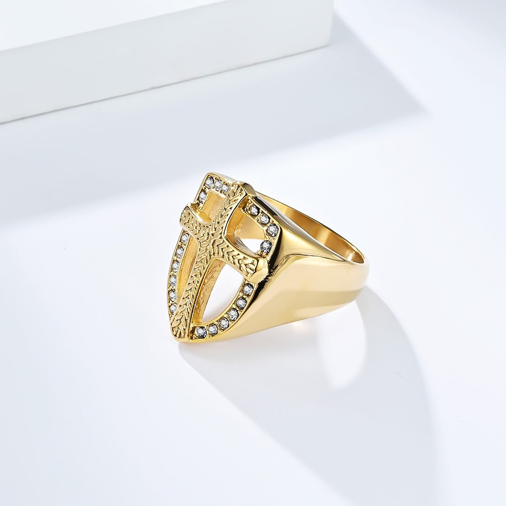 Bold choice for men — Kemstone’s stainless steel shield cross ring with zircon inlay. Vintage design in silver, gold, or black for strength and style.