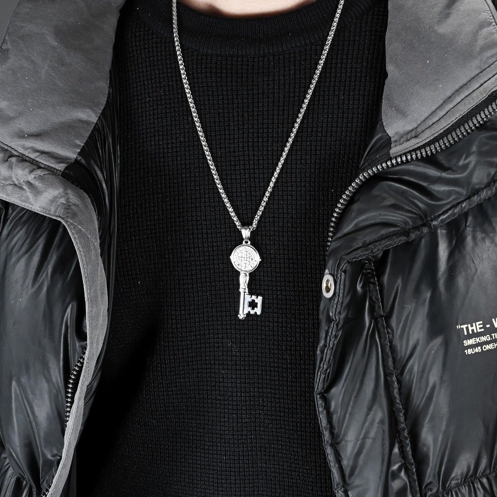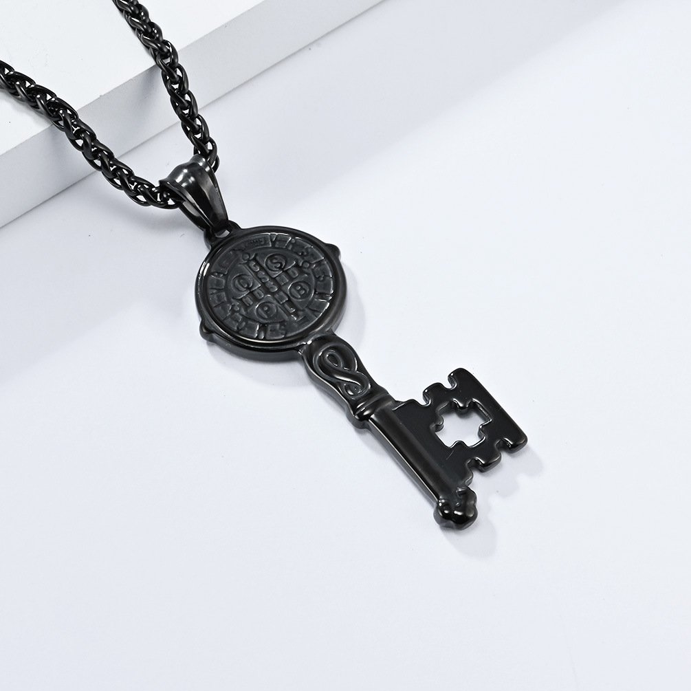 Wear grounded symbolism with this stainless steel St. Benedict key pendant necklace. Defined relief details, balanced proportions, and a steady structure support composed daily wear.