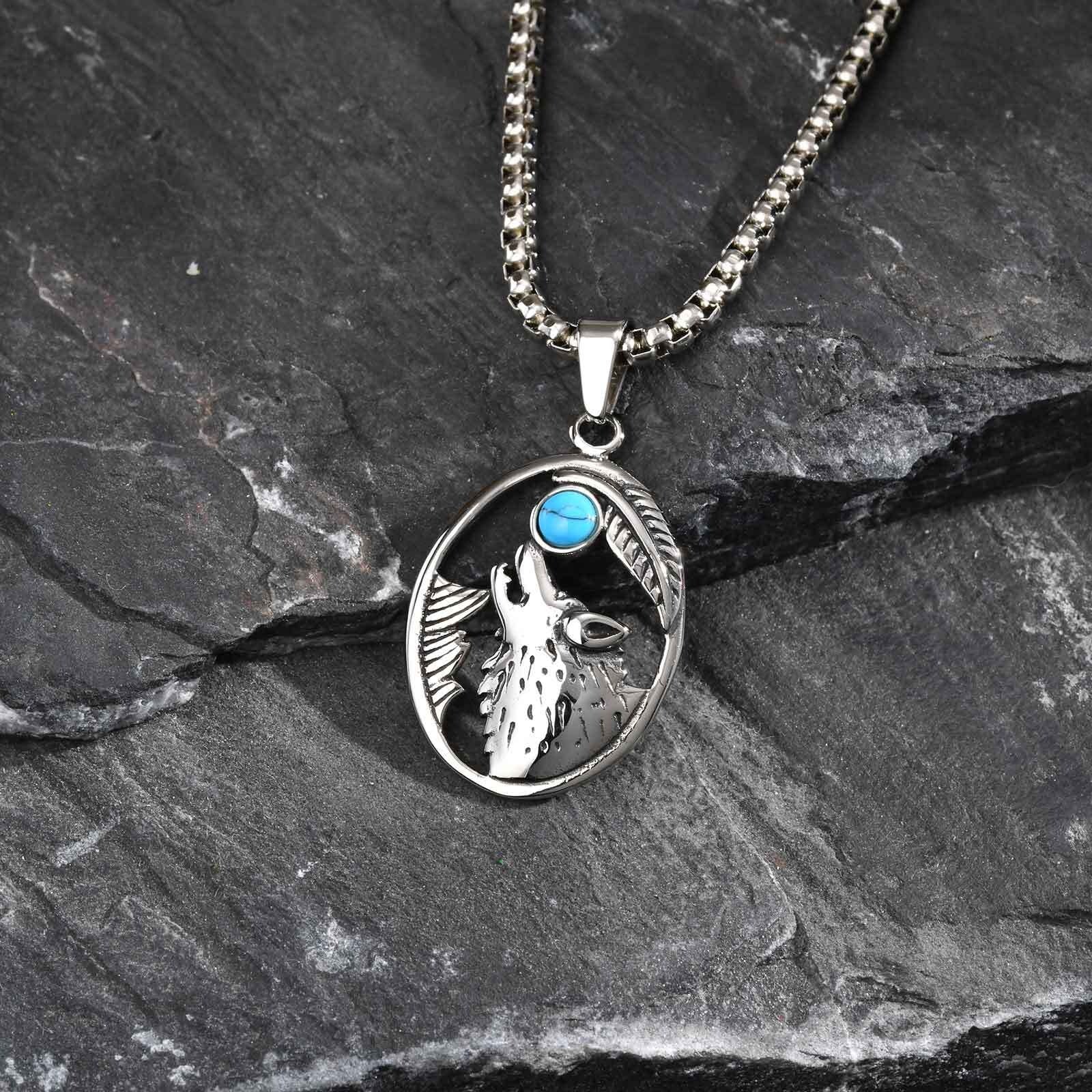 🔮 Wolf Pendant Necklace – Striking wolf head pendant with turquoise stone symbolizes strength, loyalty, and masculine energy.
