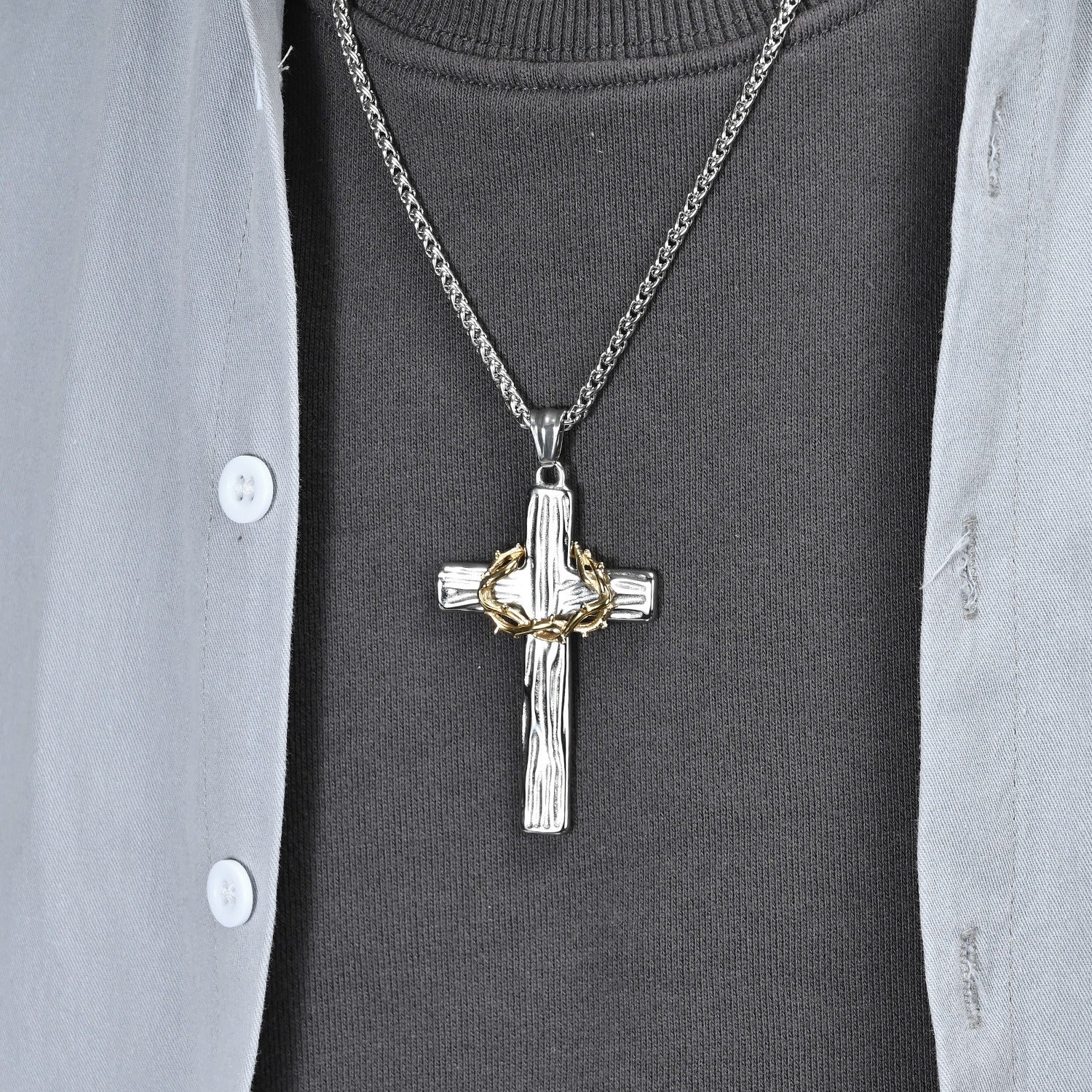 Wear a titanium steel cross necklace with vintage wood-grain detail and golden wreath accent. A prayer pendant symbolizing faith, strength, and inner peace.