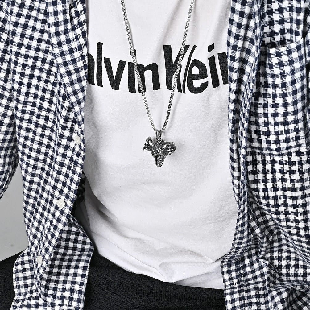 Style Kemstone’s titanium steel ram head necklace for men. Gothic pendant with pentagram design, symbolizing mystery, strength, and individuality.