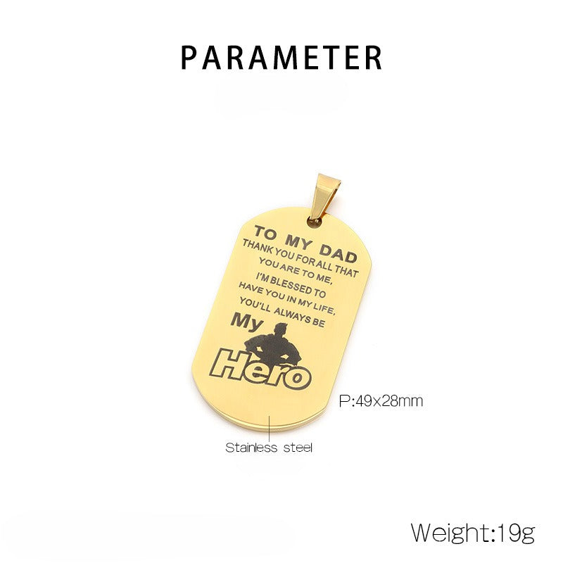 Wear Kemstone’s men’s titanium steel necklace with laser-engraved “My Hero” pendant. Durable, bold, and perfect for daily style or gifting.