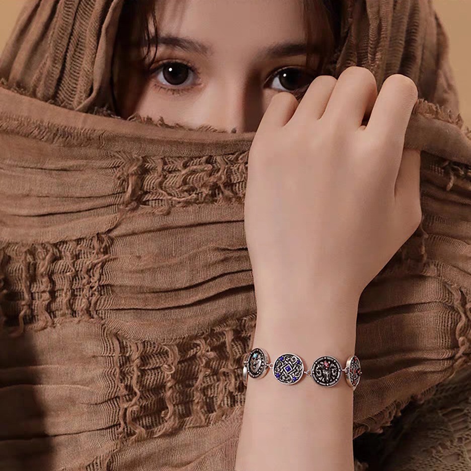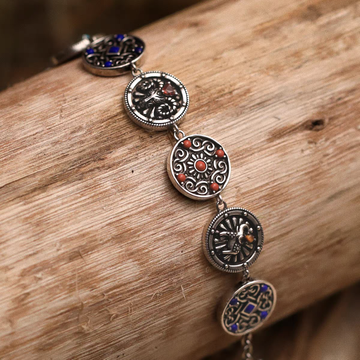 Crafted from 925 sterling silver with oxidized finish, this women’s bracelet features turquoise, lapis lazuli, carnelian, and garnet. A bohemian urban jewelry piece inspired by nomadic style, perfect for layering or gifting.