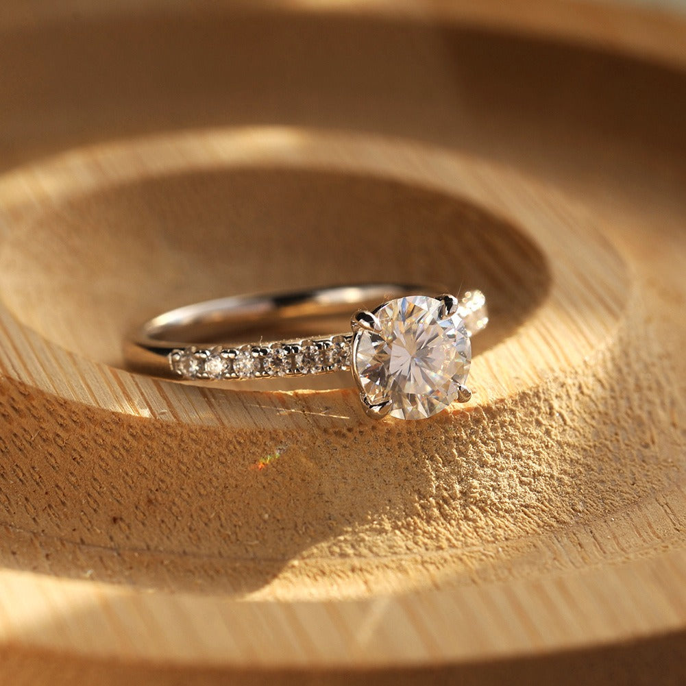 The band features smaller accent stones, carefully set along the band to add a sophisticated, radiant touch that complements the larger moissanite stone.