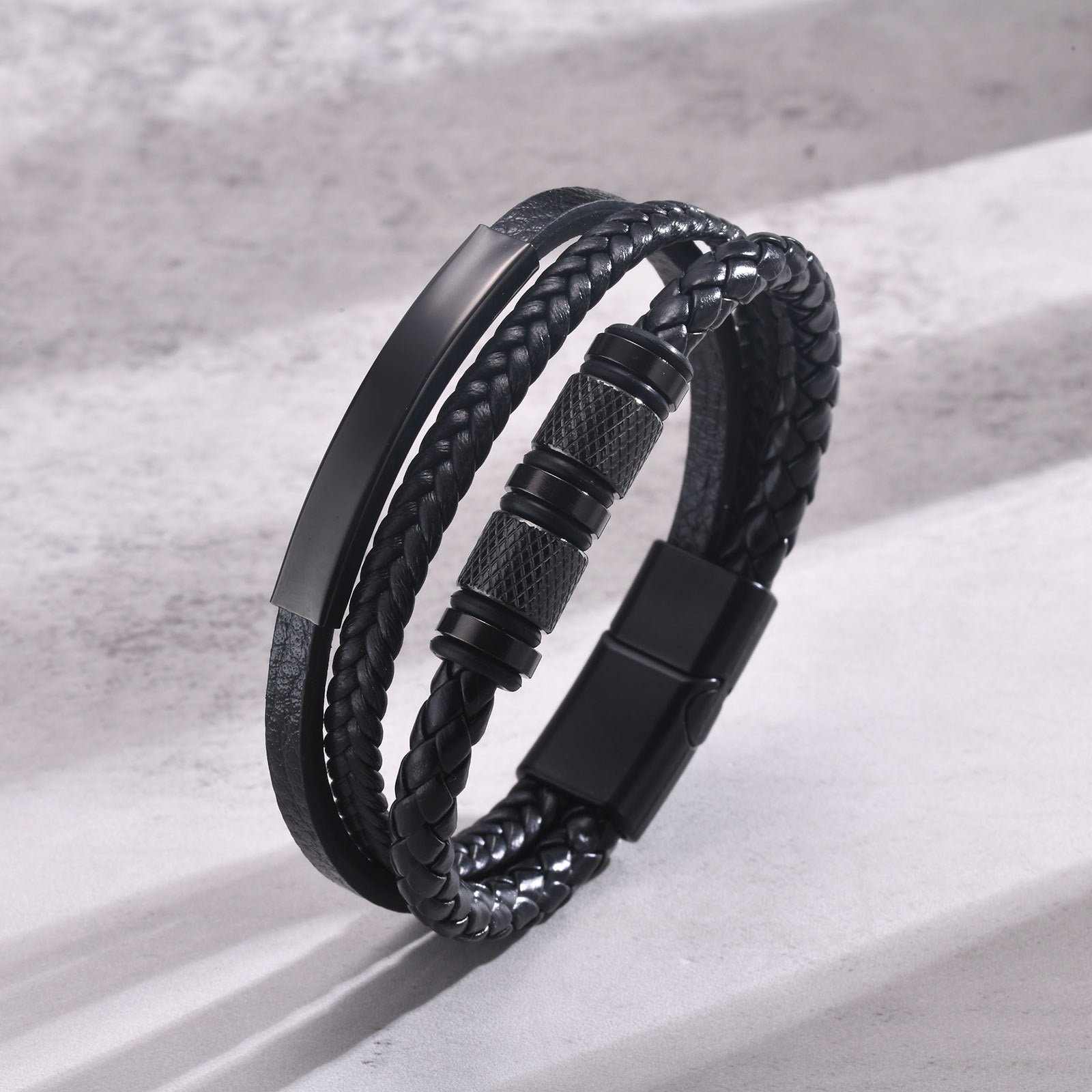 Wear confidence with Kemstone’s men’s black leather bracelet — a triple-layer braided design with titanium steel detail that embodies modern masculine strength.