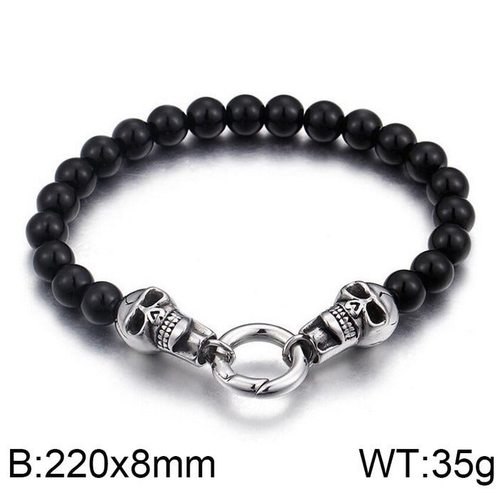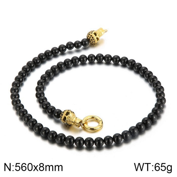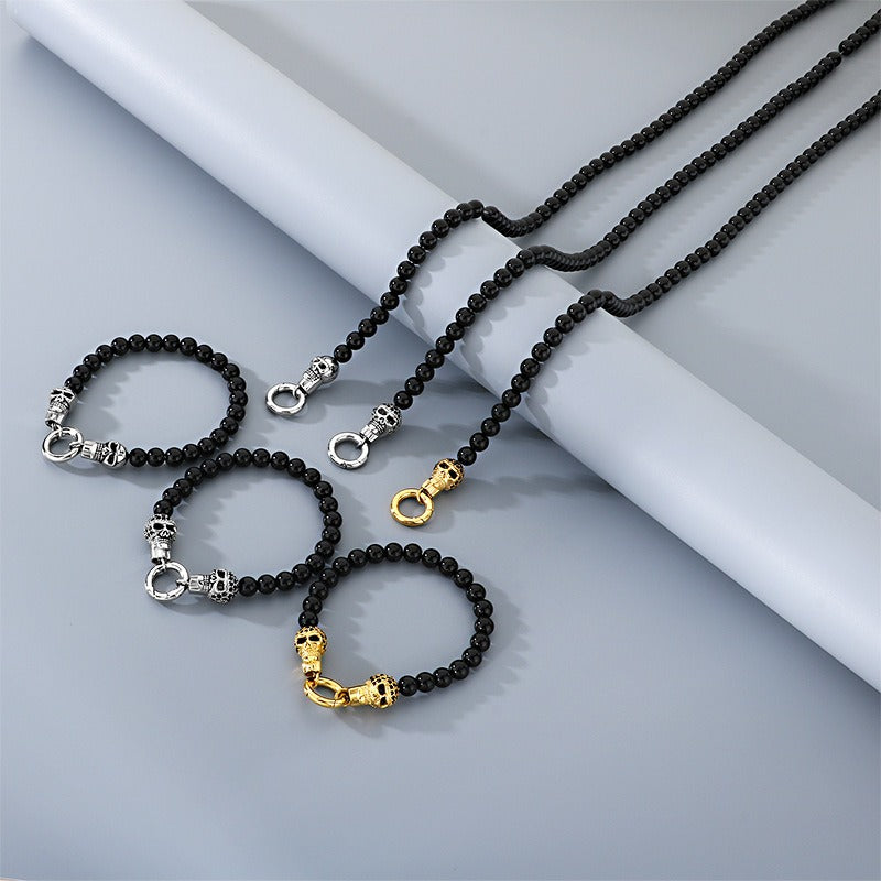 Wear black onyx bead jewelry designed around balanced weight and controlled contrast. Smooth onyx beads and titanium steel skull details create a steady piece built for everyday wear.