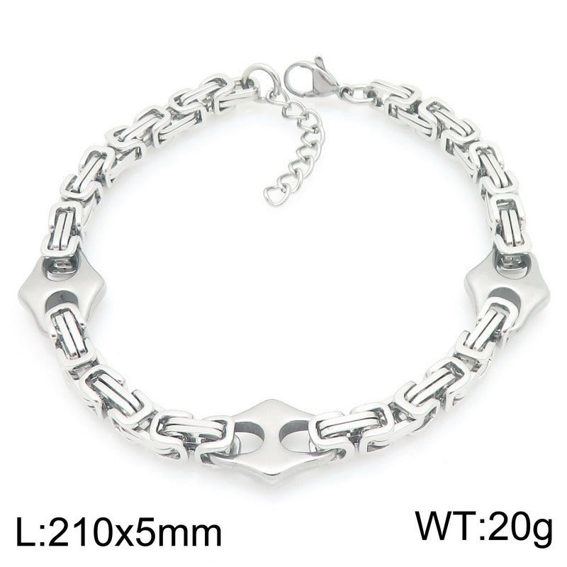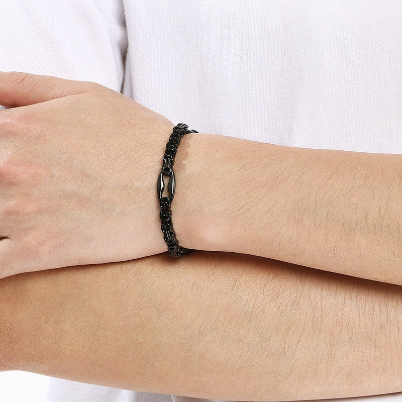 Wear a titanium steel Byzantine chain bracelet that follows the wrist naturally, with interlocking links creating steady flow, controlled weight, and a composed street profile.