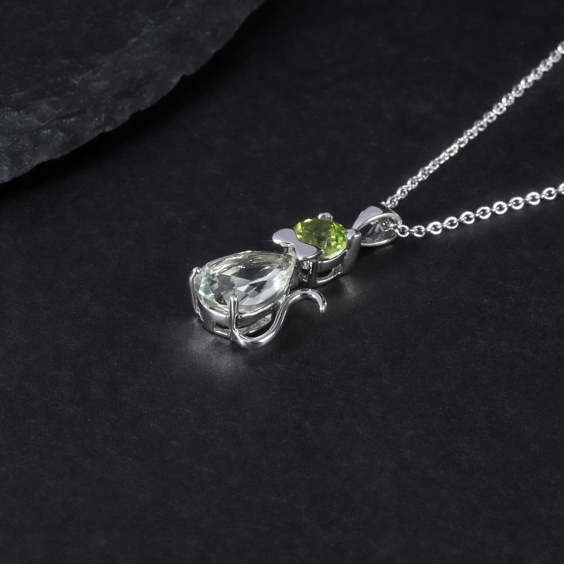 Kemstone Handcrafted S925 Sterling Silver Cat Pendant Necklace – Natural Green Amethyst & Peridot Accents, 18"